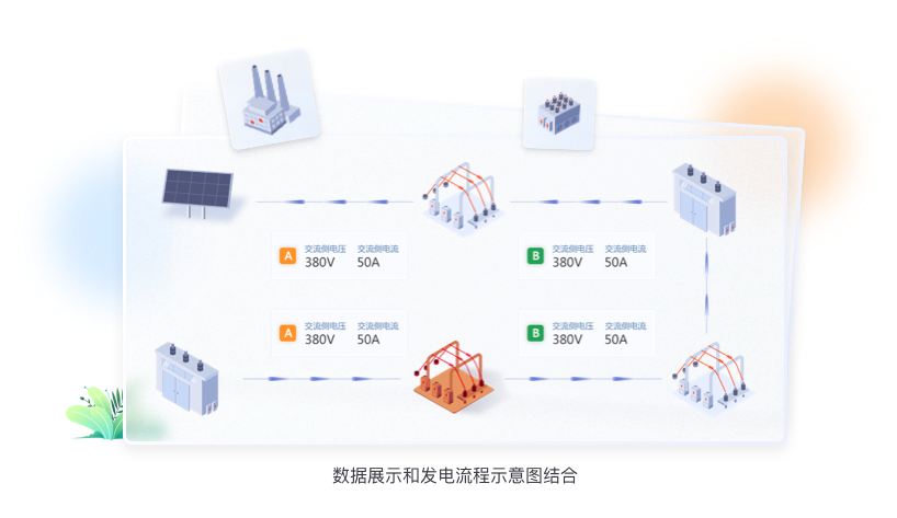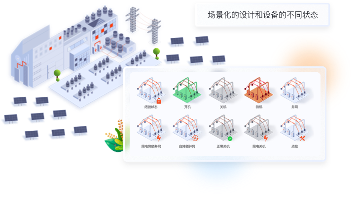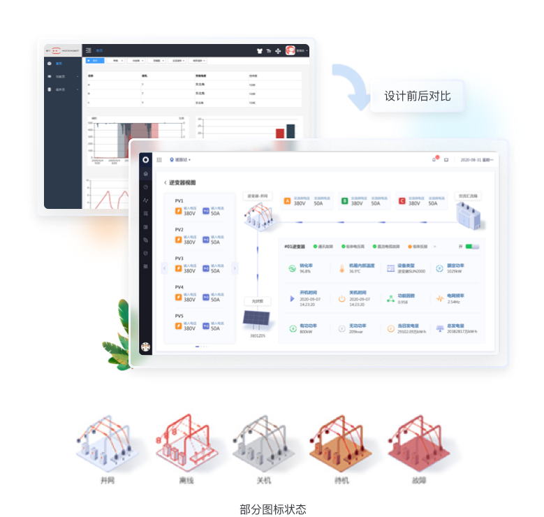 針對(duì)數(shù)據(jù)信息發(fā)生的變化,我們使用“場(chǎng)景化設(shè)計(jì)原則“,用立體圖標(biāo)方式繪制出從”光伏板-逆變器-交流匯流箱“發(fā)電原理圖,把數(shù)據(jù)展示在對(duì)應(yīng)的環(huán)節(jié)中,形成可視化的實(shí)時(shí)監(jiān)控圖譜。;其余與發(fā)電流程無(wú)關(guān)的數(shù)據(jù)也均以圖標(biāo)+文字的形式展示頁(yè)頁(yè)面右側(cè)。