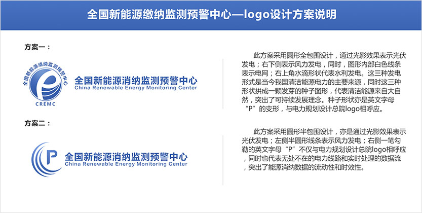 11月5日初次需求調(diào)研提出需求: 1.logo要體現(xiàn)中國電力規(guī)劃總院元素 2.顏色配比與電力規(guī)劃總院保持一致 3.突出風(fēng)電,光伏發(fā)電元素,電網(wǎng)元素和監(jiān)測動態(tài)性 4.樣式設(shè)計要簡潔,沉穩(wěn)大氣,體現(xiàn)專業(yè)性