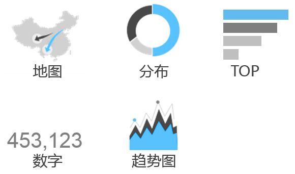 分析清楚數據后,就要找個合適的箱子把這些“蘋果”裝進去。上一步,或許還可以靠自身的邏輯能力,采集到的現成數據分析得到,而這一步更多地需要經驗和閱歷。幸運的是,現在已經有很多成熟的圖形可以借鑒了。從和業務的溝通了解到,需要匹配的圖形有中國地圖、餅圖、top圖、數字、趨勢等。
