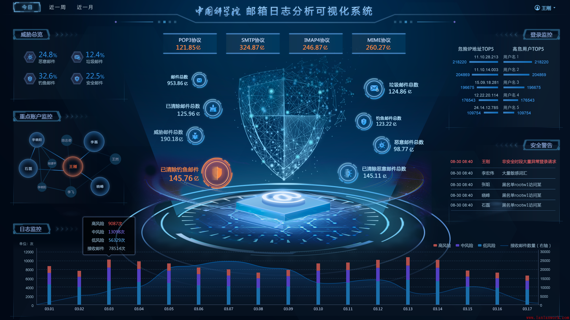 藍藍設計也在給中科院各個院所設計界面,上圖是給郵箱日志分析可視化系統設計的界面概念稿。為了設計好,我們搜集了各種資料文章和行業界面參考,了解郵件系統的行業術語,畫出交互原型、視覺設計稿。
