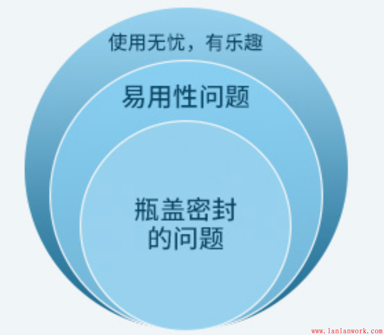 第三層再用更抽象的語言去定義:挑戰(zhàn)是“使用無憂,有樂趣”。毎個定義不同,指向的解決方案就不同,最后一個或許是給了足夠的開放的空間,以產(chǎn)生出創(chuàng)造性解決方案的,例如可分離式容器。
