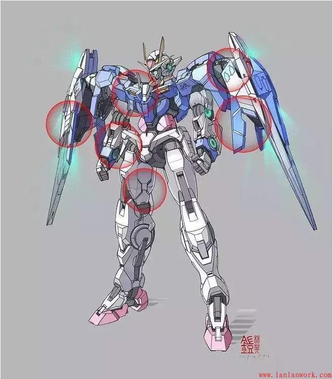 第二部就是元素組合,我們需要提取了我們可能需要的元素,就像我們設計時面對自己手機素材一樣,這個時候我們不要急于立馬去設計,要仔細思考其設計形式,元素的位置安排。我們還是以以高達為例,途中我圈出了我可能用到的圖形元素。