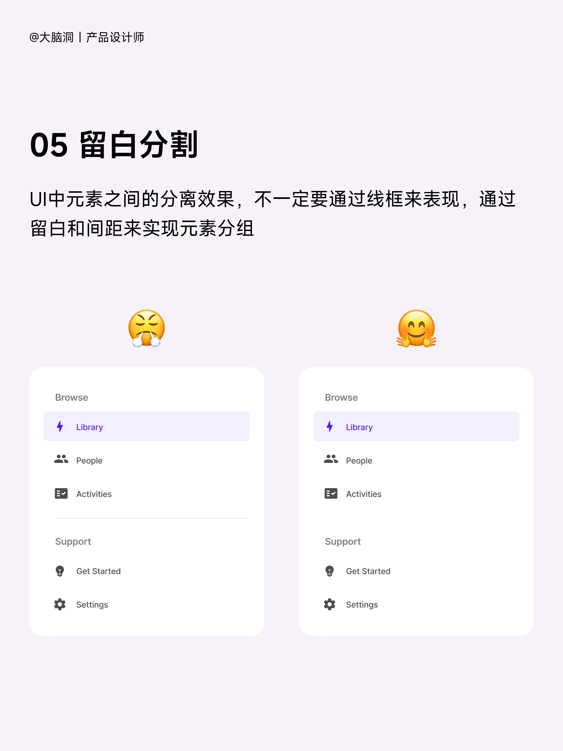 不要吝嗇界面留白,基于親密性原則,在合理的將信息進行分組之后,請大膽使用留白,應避免元素與元素、與信息組之間過于密集,保持界面的呼吸感,給用戶更為舒適通透的體驗。