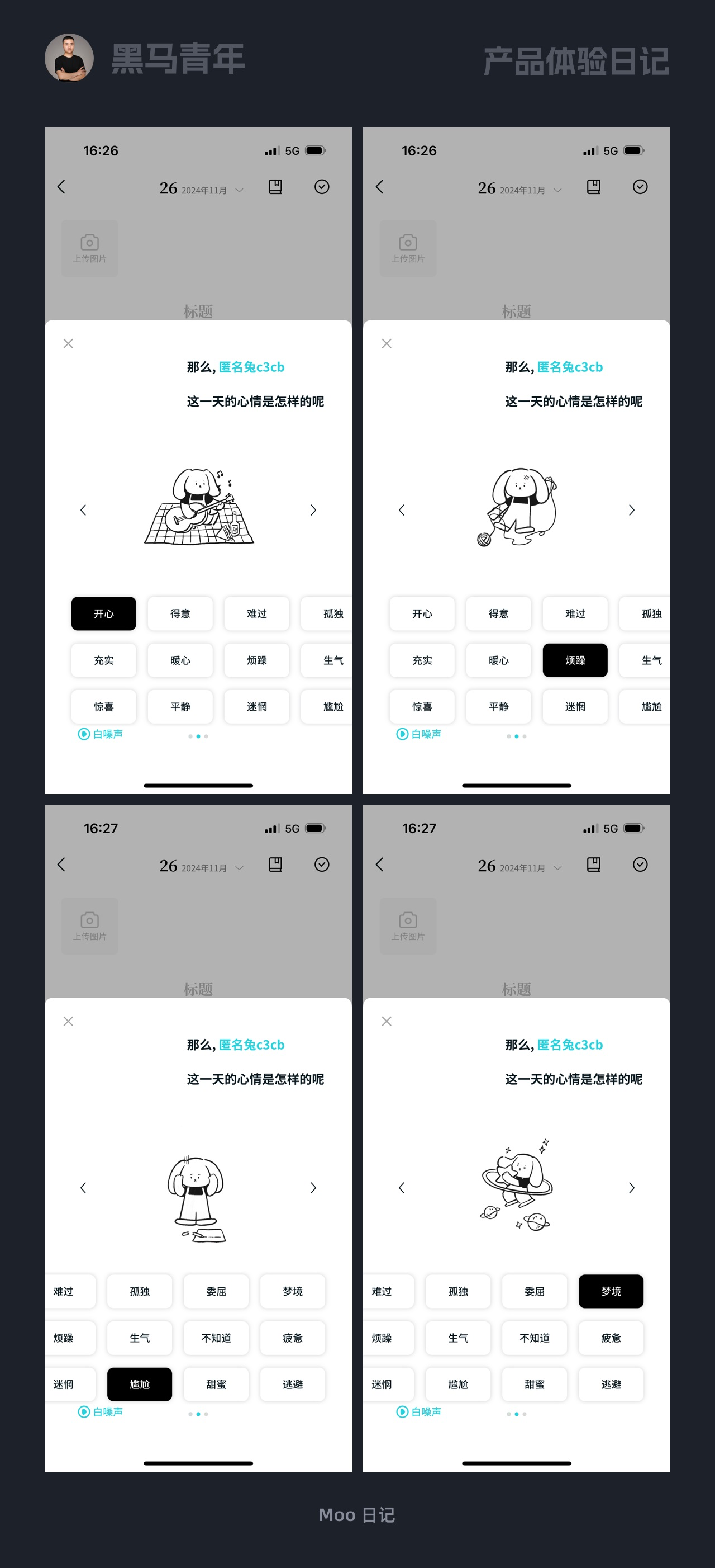 日記類產品的核心是記錄情緒,Moo 日記 App 打破傳統文字 / 單色標簽的局限,為每一種心情匹配專屬動態場景插畫。