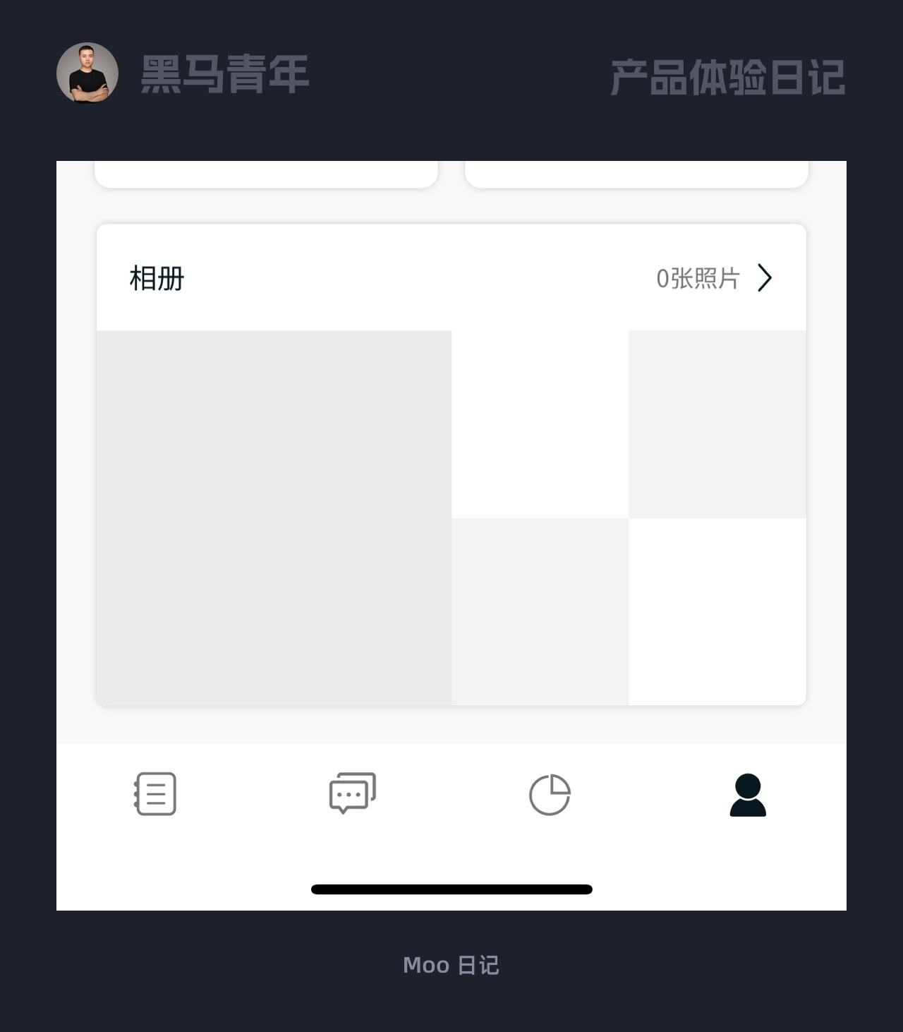 新用戶首次使用時,空狀態是極易被忽視的體驗觸點。Moo 日記個人中心相冊入口,摒棄傳統文字 + 簡單插畫的形式,采用照片結構化展示填充空狀態。
