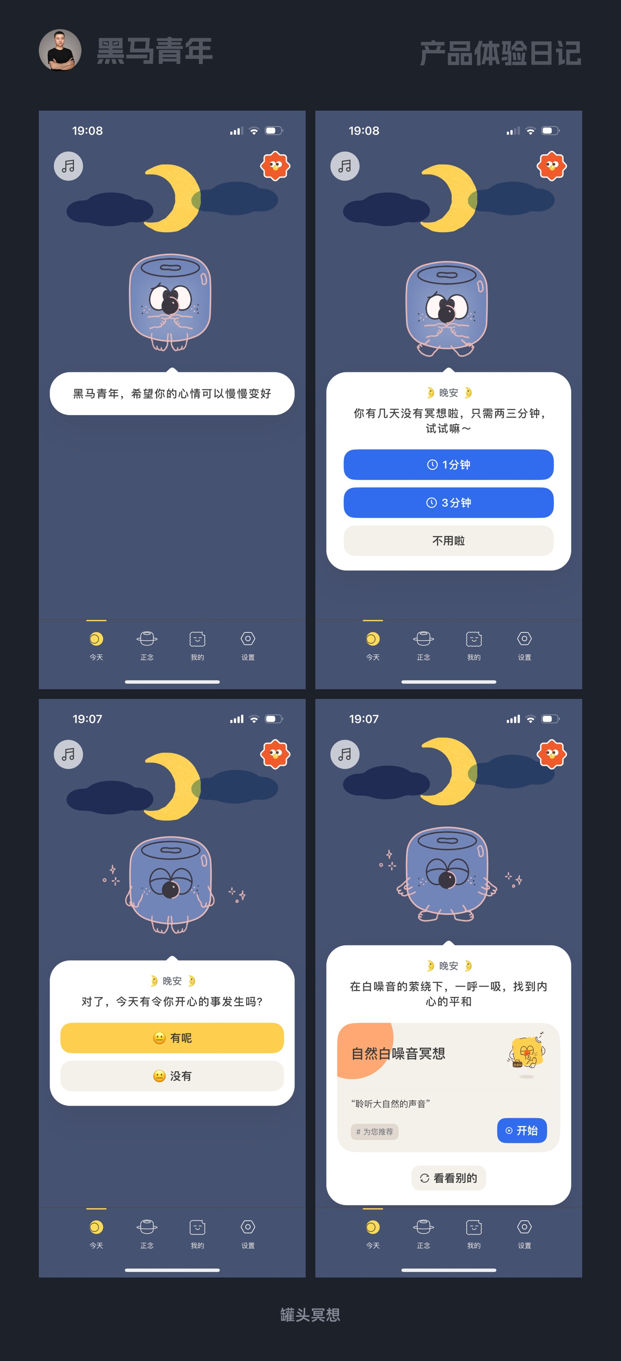 生硬的步驟指引容易讓用戶放棄,罐頭冥想 App 采用朋友式對話交互做操作引導。