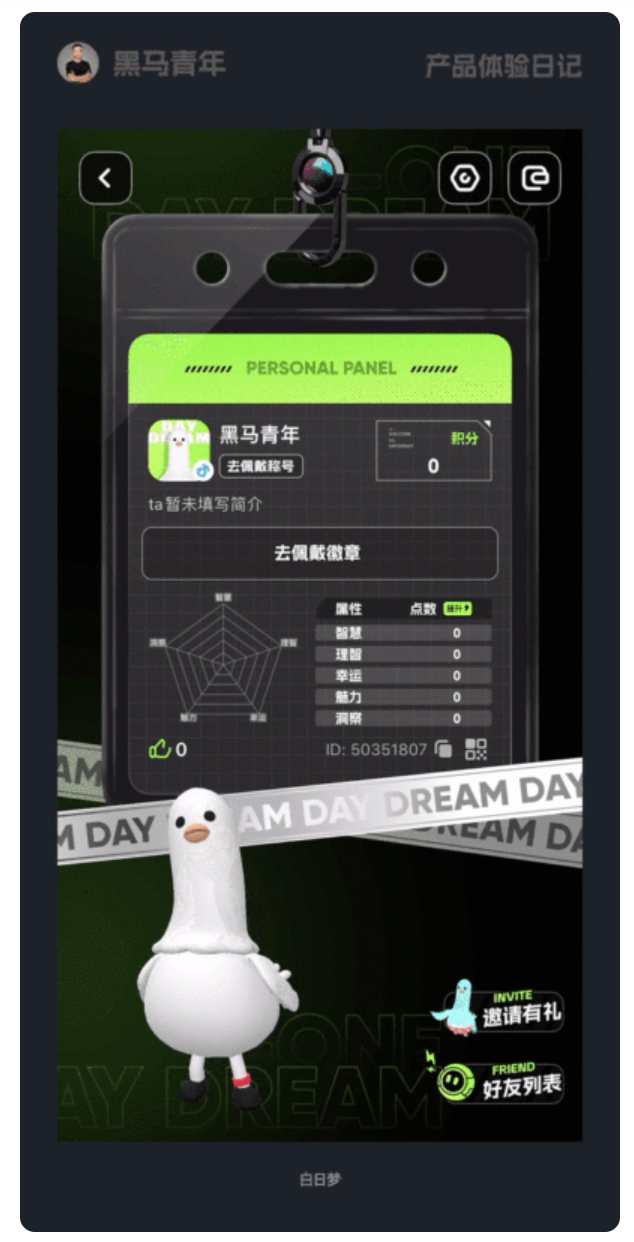 個性化時代,千篇一律的個人中心已無法滿足用戶。白日夢 App 采用鬼馬動態 IP+ 獨特視覺風格,打造辨識度極高的個人中心。