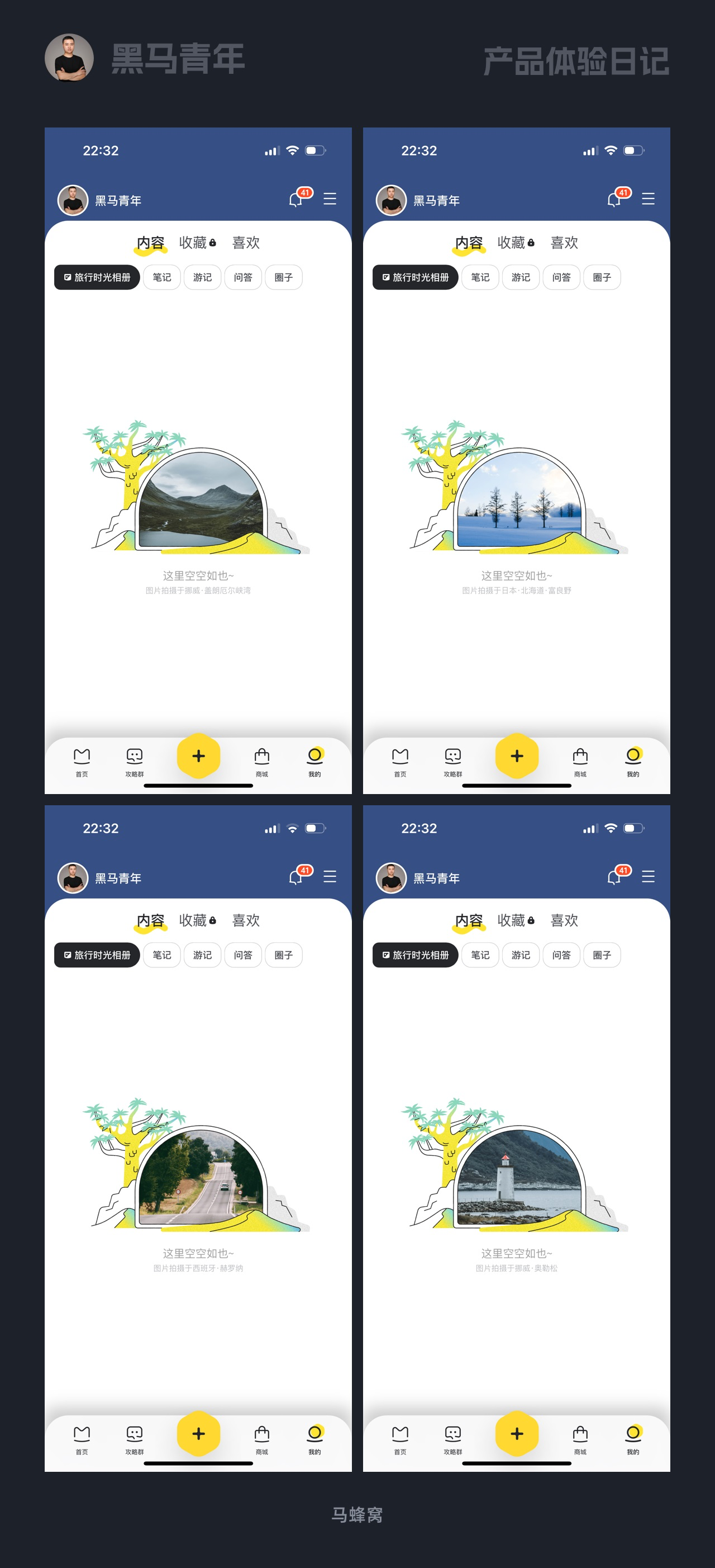 馬蜂窩 App 的空狀態設計緊扣旅行屬性,采用相框 + 隨機風景插畫形式,點擊可切換不同風景。