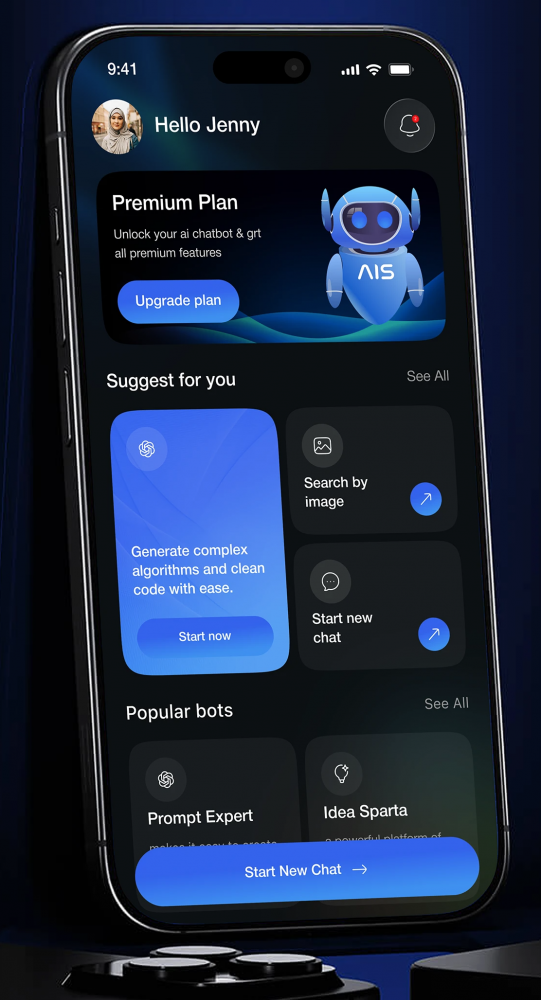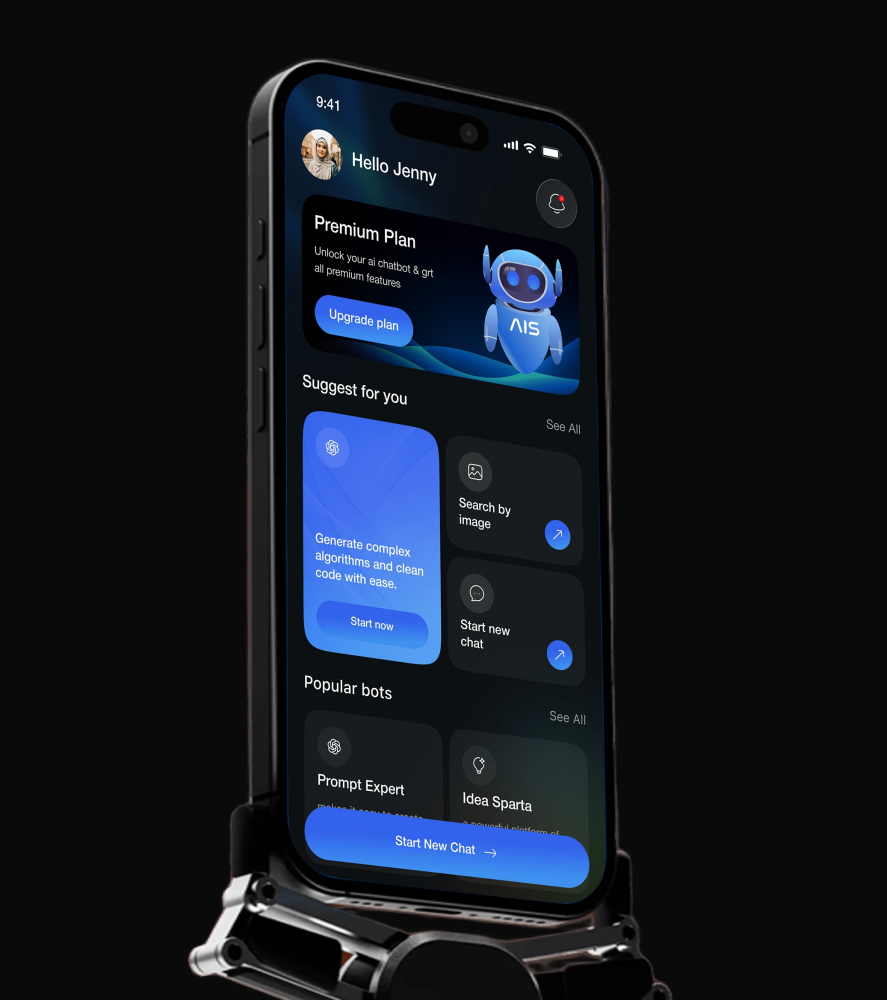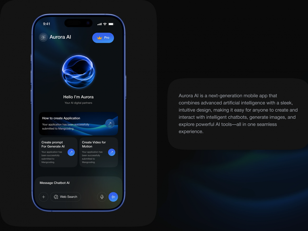 以深邃純黑為底色,搭配高飽和科技藍為主色調,用流體狀動態 AI 圖標貫穿全端,既凸顯 AI 的技術屬性,又通過柔和光影弱化工具的冰冷感,讓 AI 更具 “數字伙伴” 的陪伴感;界面采用圓角卡片、高對比度按鈕,信息層級清晰,核心功能突出,完美平衡科技感與易用性。