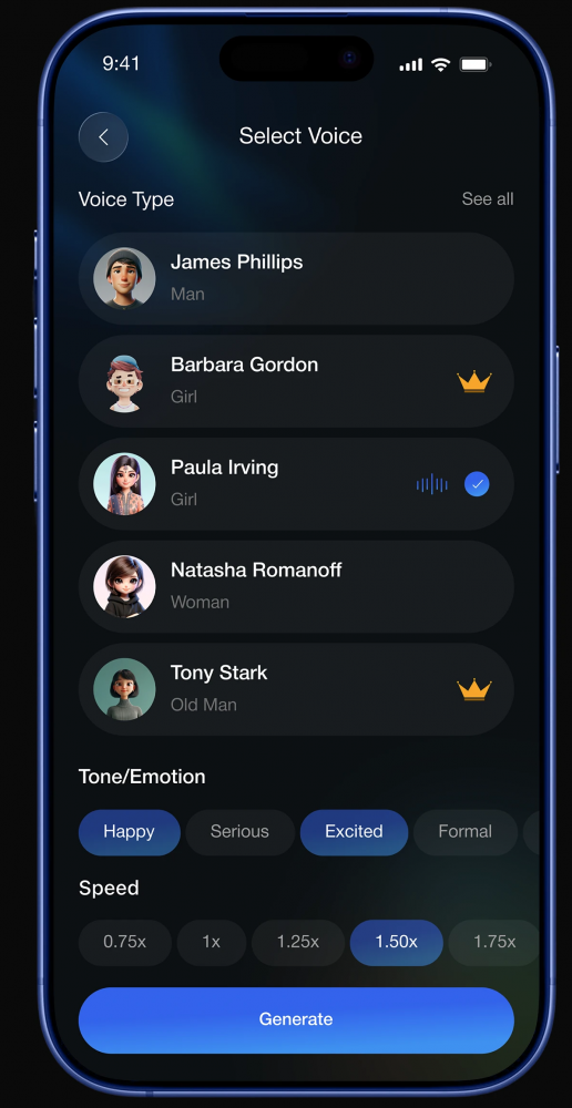 支持文字、語音、圖片多模態交互,語音頁用動態聲波可視化反饋,強化陪伴感;提供豐富的語音類型、語調、語速自定義選項,支持多 AI 模型一鍵切換,滿足不同場景需求,同時自然引導付費轉化,兼顧體驗與商業價值。