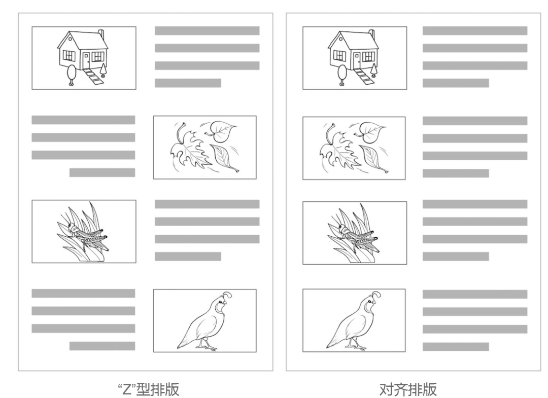 2. 裝飾型圖片:優先用左對齊排版,用戶可自動忽略,不干擾文字閱讀;Z 型排版會增加圖片曝光,但易分散視線;