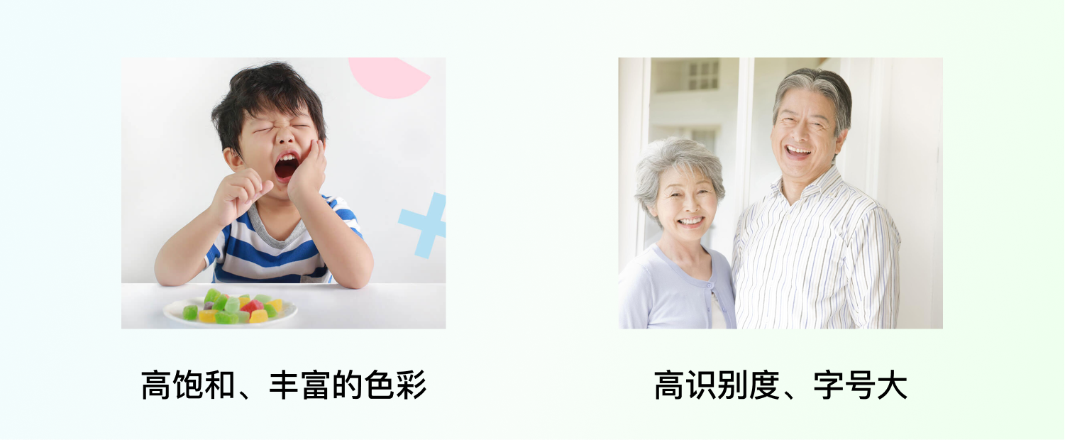 小孩喜歡高飽和、豐富的顏色,而老人則需要考慮在各種場景下都能看得清楚信息的顏色。