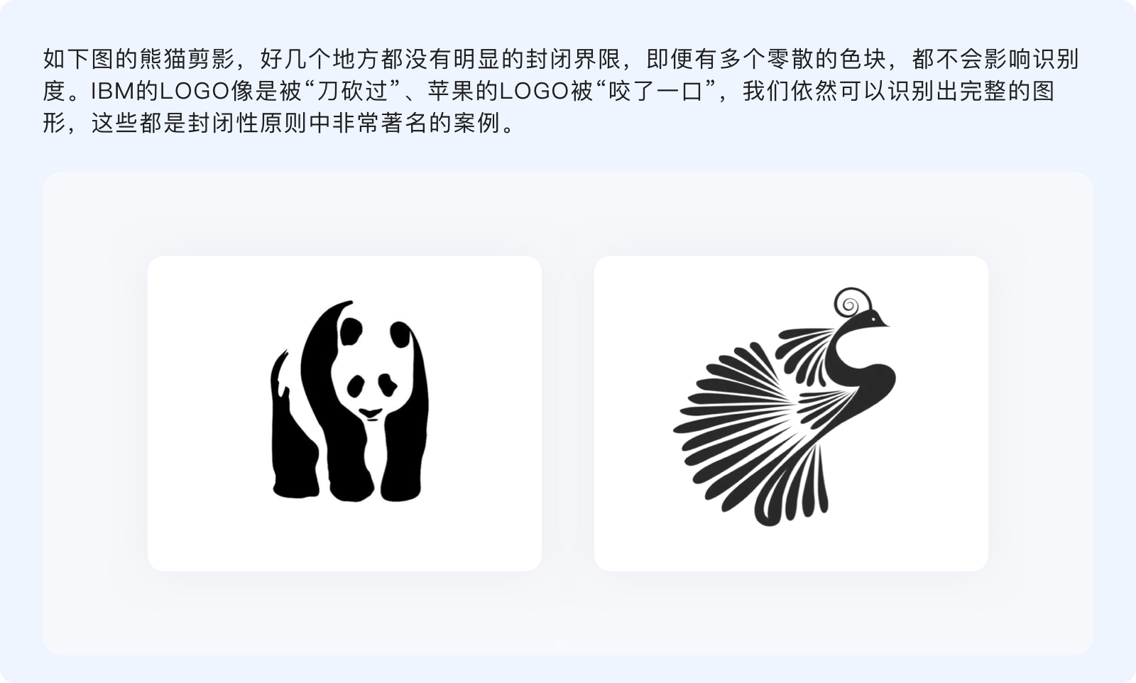 封閉性原則指出,人們的視覺系統(tǒng)傾向于將不完整的局部當(dāng)做一個(gè)整體來感知??雌饋砼c連續(xù)性有諸多相似,不過連續(xù)性是通過物體的形狀和運(yùn)動(dòng)方向、按照視覺慣性來制定閉合規(guī)律,而封閉性則并無特定規(guī)律,只要把握好不完整物體的尺度、使各元素之間相互輔助,就能讓其與我們認(rèn)知模型中的原型匹配。
