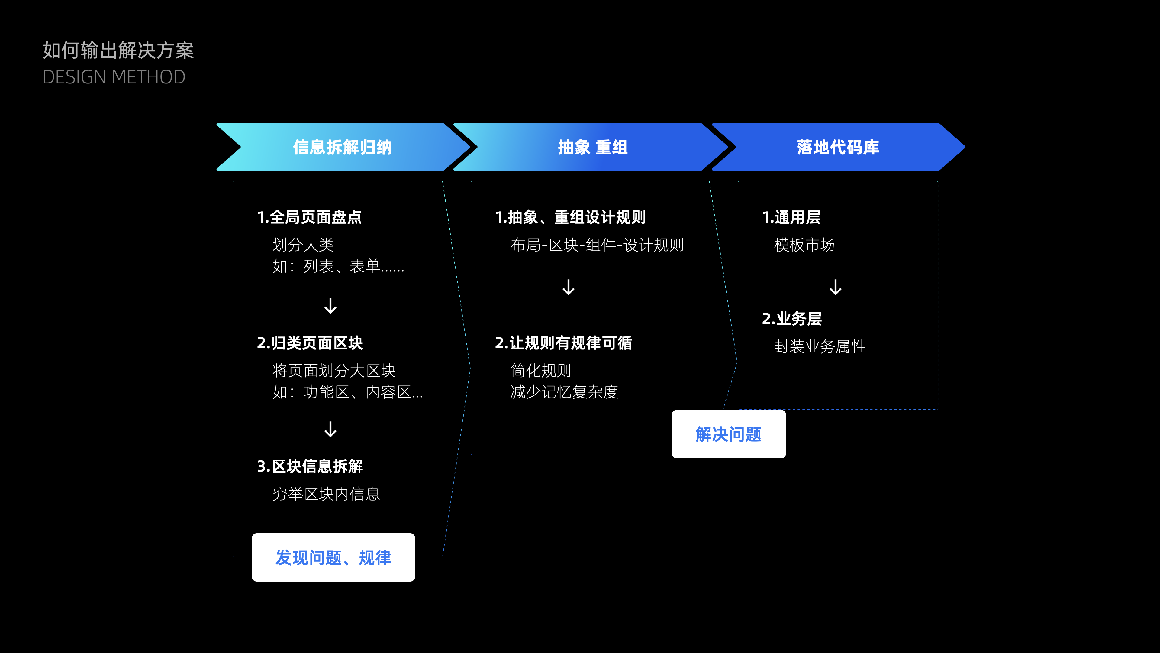 所以如何解決團隊效率和產品質量問題?我們的解法是抽象體系化的解決方案:設計模式化和代碼化,設計從原子到全局進行統一和優化,并形成系統化的設計指導,由開發進行模式代碼化,提供靈活可配置的規則。以此,設計有更系統化的設計原則,整體的統一性和體驗有保障,設計和開發周期也可以縮減,甚至大部分日常需求可直接由產品對接開發直接上線。