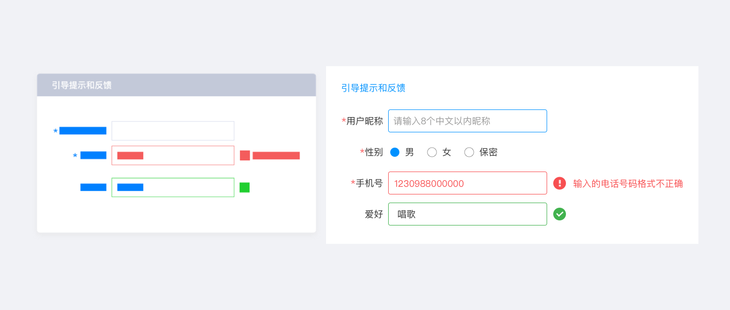 反饋提示發生在輸入中或輸入后,通過實時判斷信息字段是否符合規定,進行提升反饋,減免錯誤。