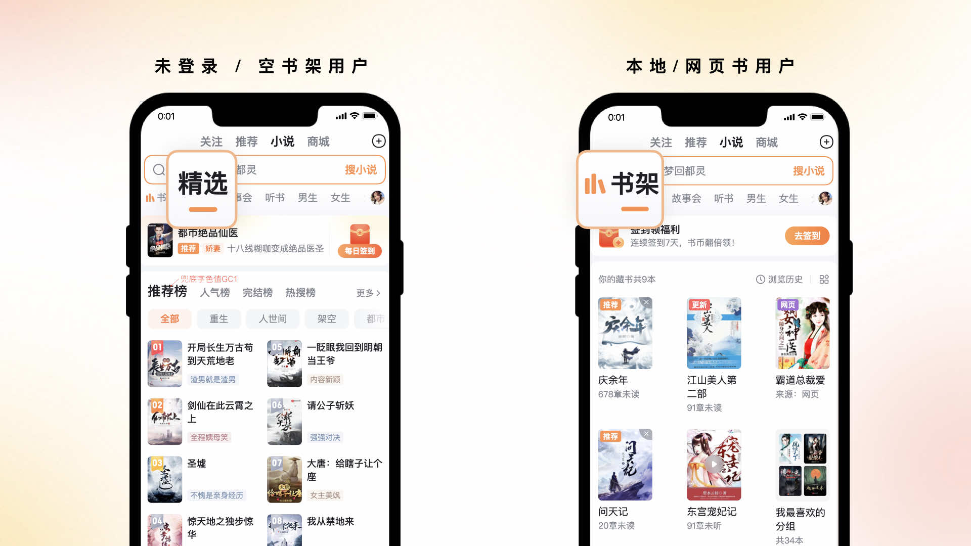 以人為本的設(shè)計能夠更貼心地滿足用戶的需求和期望,通過關(guān)注用戶的喜好、行為和習(xí)慣,讓用戶體會到關(guān)懷和舒適的享受。因此,針對于不同的用戶行為進行了精細化的設(shè)計。對于未登錄、書架為空的用戶,我們默認(rèn)為用戶錨定到精選的tab,而針對本地書、網(wǎng)頁書的用戶,我們?yōu)槠涠ㄎ坏綍艿膖ab,方便用戶更精準(zhǔn)的切入場景。