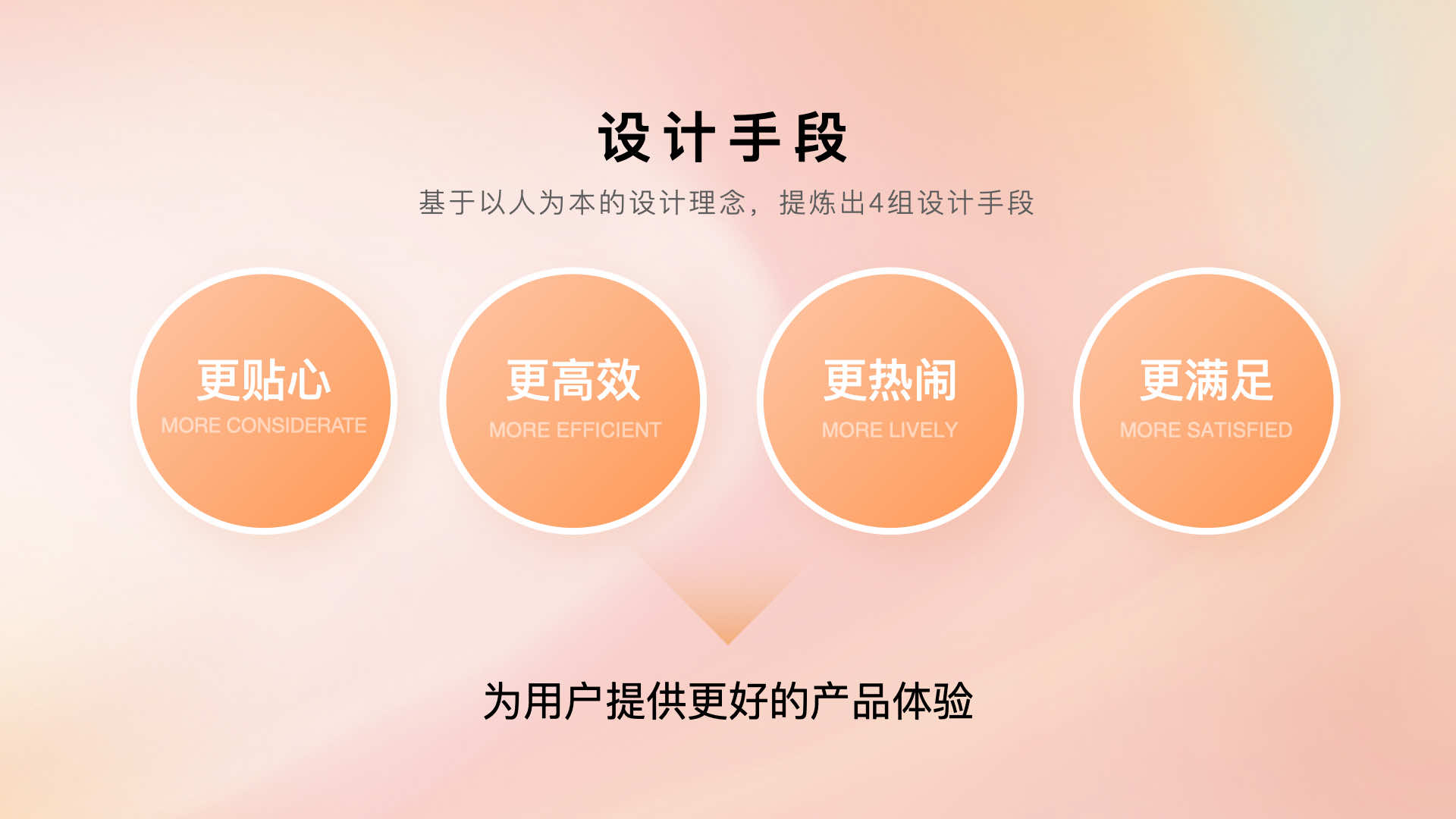 以人為本的設(shè)計理念不僅僅是視覺層面的展現(xiàn),還需要從用戶需求維度提供人性化的產(chǎn)品體驗,因此,我們提煉出了四組設(shè)計手段:更貼心、更高效、更熱鬧、更滿足。