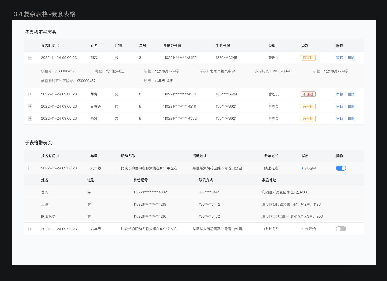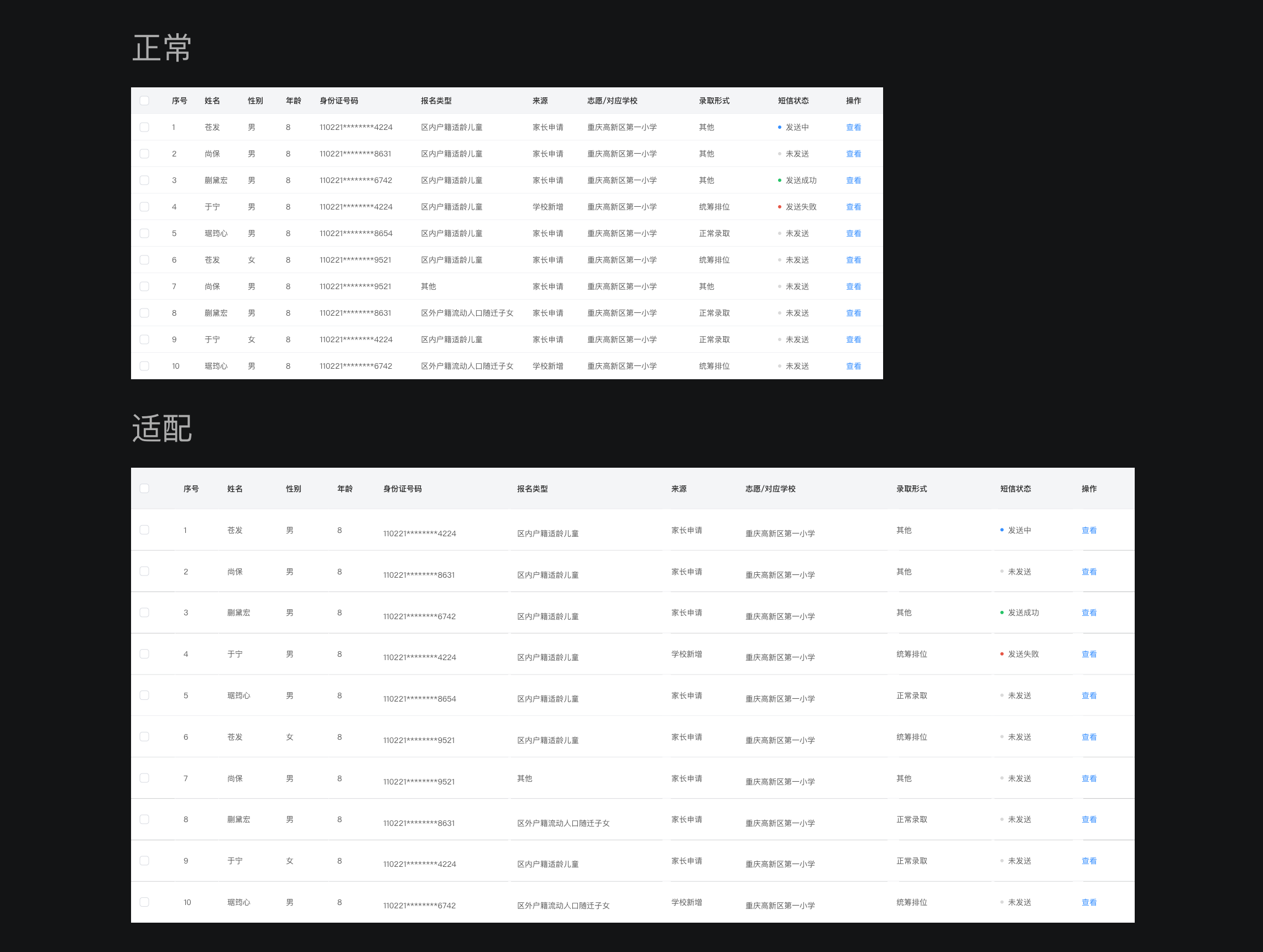 表格設計中一定不要使用過多的顏色區做狀態或操作的區分,過多的顏色細分會使表格變得更加混亂,影響用戶體驗。對狀態的區分,僅用輕量的顏色區分即可,操作欄保持主色按鈕色。
