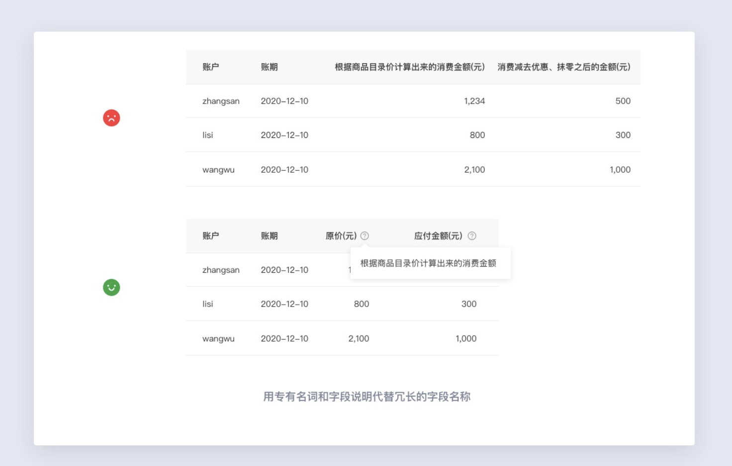 當字段名稱過長,又必須展示,才能有效的理解字段含義時。我們可以定義一個專有名詞代替,并且在字段名稱后使用添加字段說明的形式,來對字段加以說明。這樣一來用戶既可以清晰的理解字段含義,又可以在有限的頁面空間下獲取到更多的數據信息。