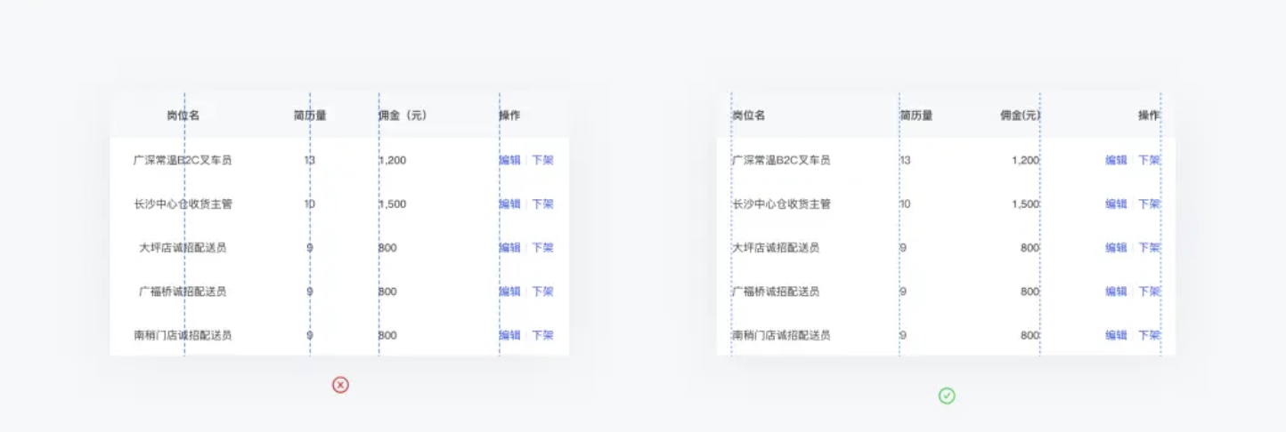 合適的對齊方式能夠提升數據的瀏覽效率。表格內信息的縱向列對齊(符合格式塔心理學中相近原則)能夠很好的形成視覺引導線。通過對齊,會讓表格更加規范易理解,給用戶視覺上的統一感,視線流動更順暢,讓用戶快速的捕捉到所需內容。