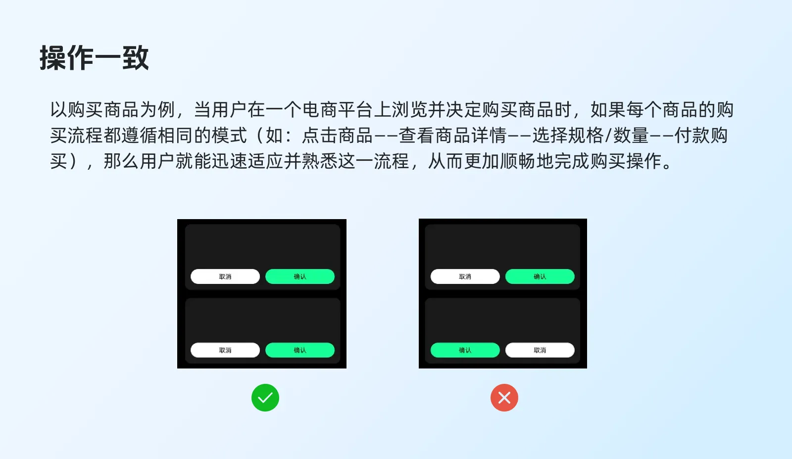 :確保用戶在執行相似任務時,如購買商品、搜索信息或提交表單等,能夠遵循相同的操作流程。這有助于用戶快速適應并高效完成任務。