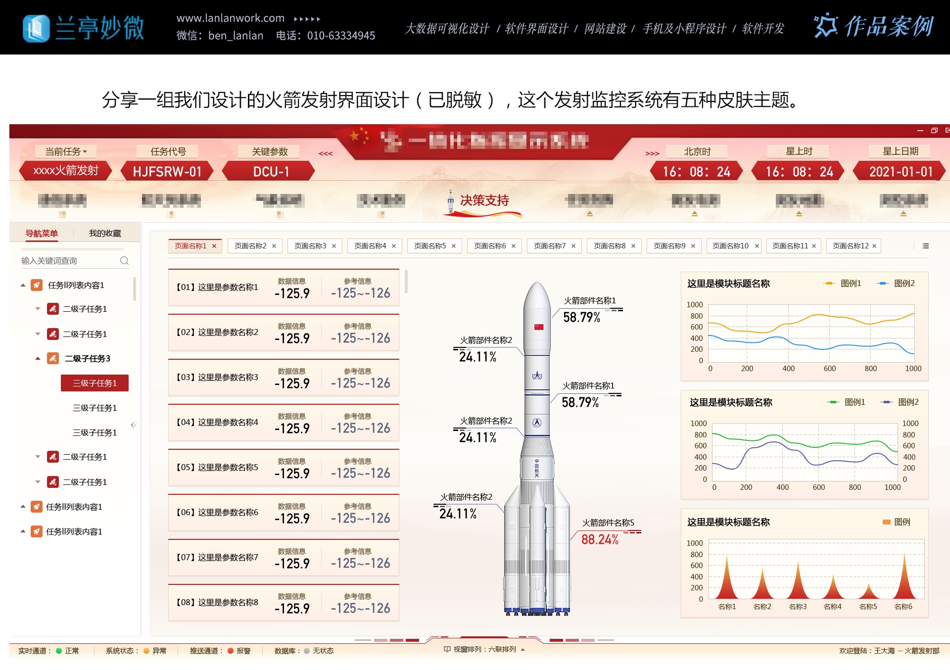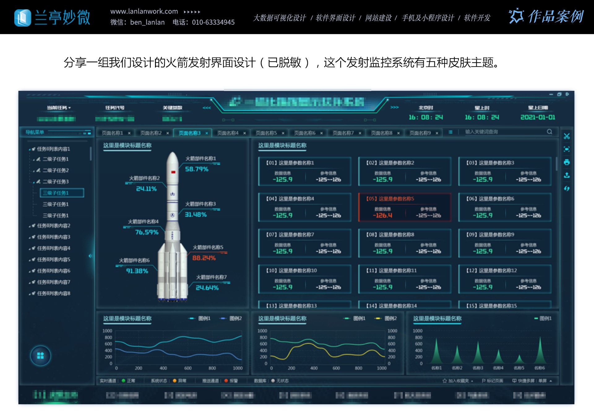 多年來,蘭亭妙微與航天四院、二院、三院、九院、中國電子等企業建立了長期的合作關系。他們的設計方案得到了客戶的高度認可和好評,為企業的發展做出了重要貢獻。選擇蘭亭妙微,就是選擇了專業、創新和品質。讓我們攜手共進,為航天軍工領域的發展創造更加美好的未來。