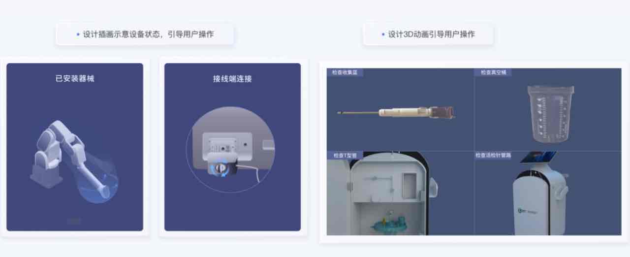 隨著科技的飛速發(fā)展,人工智能(AI)正悄悄改變醫(yī)療健康行業(yè),為其帶來前所未有的數(shù)字化轉(zhuǎn)型。未來,醫(yī)療健康行業(yè)將迎來個性化、精準(zhǔn)化、智能化的新時代。設(shè)備操作界面是醫(yī)師操控機(jī)器人的窗口,操作界面設(shè)計易用、直觀、美觀度直接影響到醫(yī)療機(jī)器人的使用效果和產(chǎn)品的品牌價值。人性化的操作界面可以提高操作者的工作效率和操作的舒適度,降低操作的學(xué)習(xí)成本和出錯率,提高手術(shù)精準(zhǔn)度和手術(shù)成功率。在UI設(shè)計中,我們結(jié)合真實的使用場景,加入插畫和建模動畫的設(shè)計,引導(dǎo)醫(yī)護(hù)人員進(jìn)行操作,從而使操作更加直觀易用,提高工作效率。
