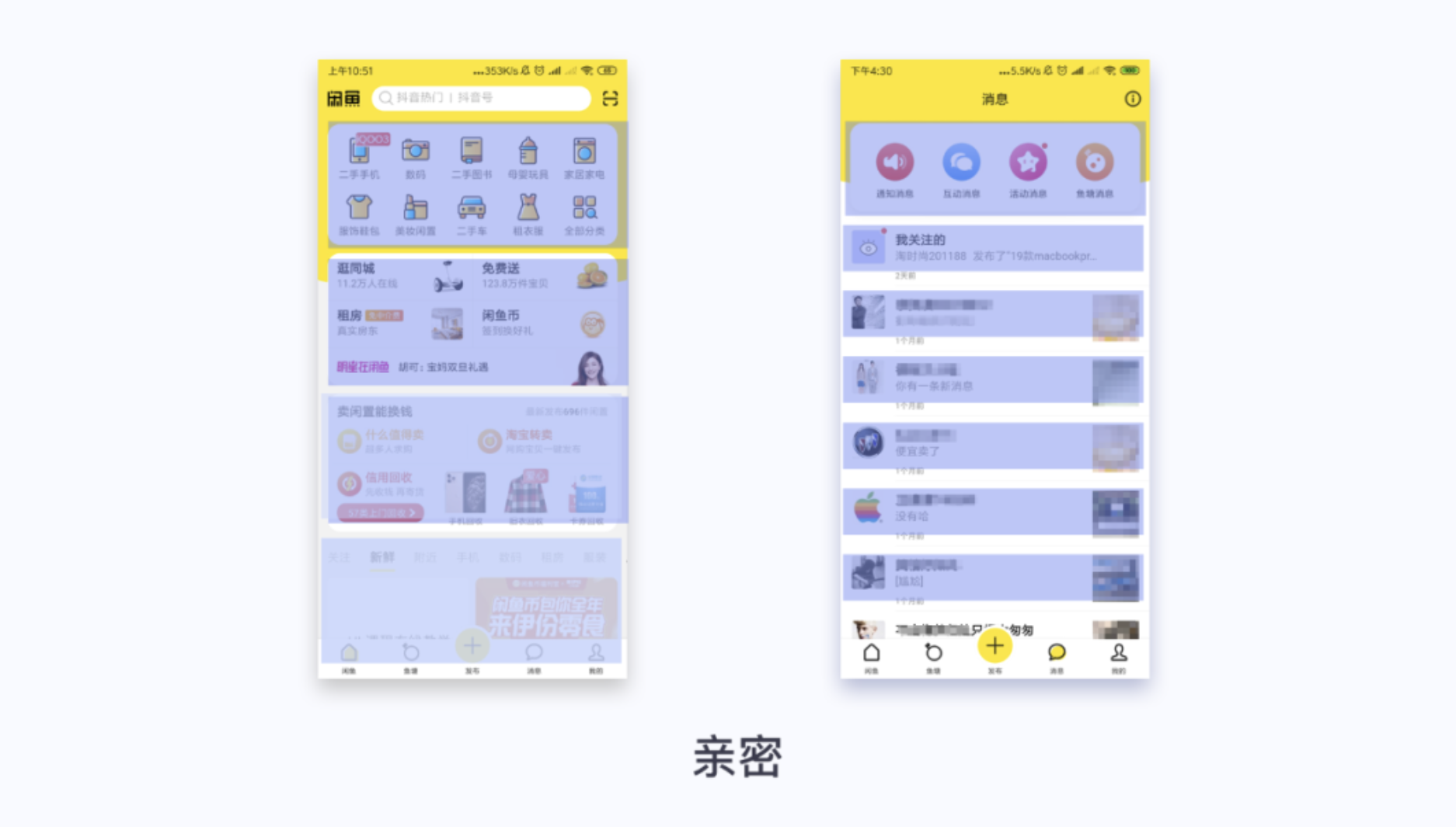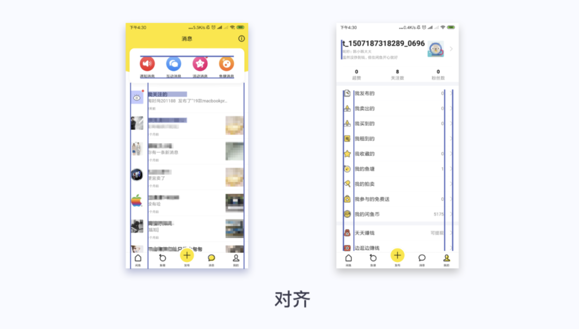 閑魚消息頁面頂部功能區域采用居中對齊方式,比較正式一些,突出顯示引導用戶點擊;個人頭像和消息左對齊顯示,發布圖片右對齊顯示。