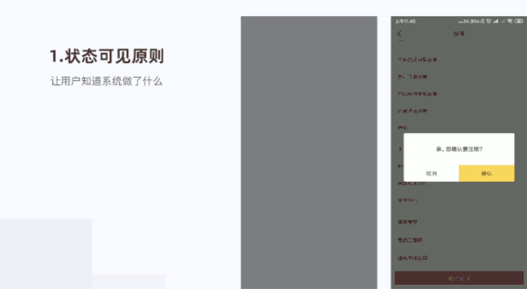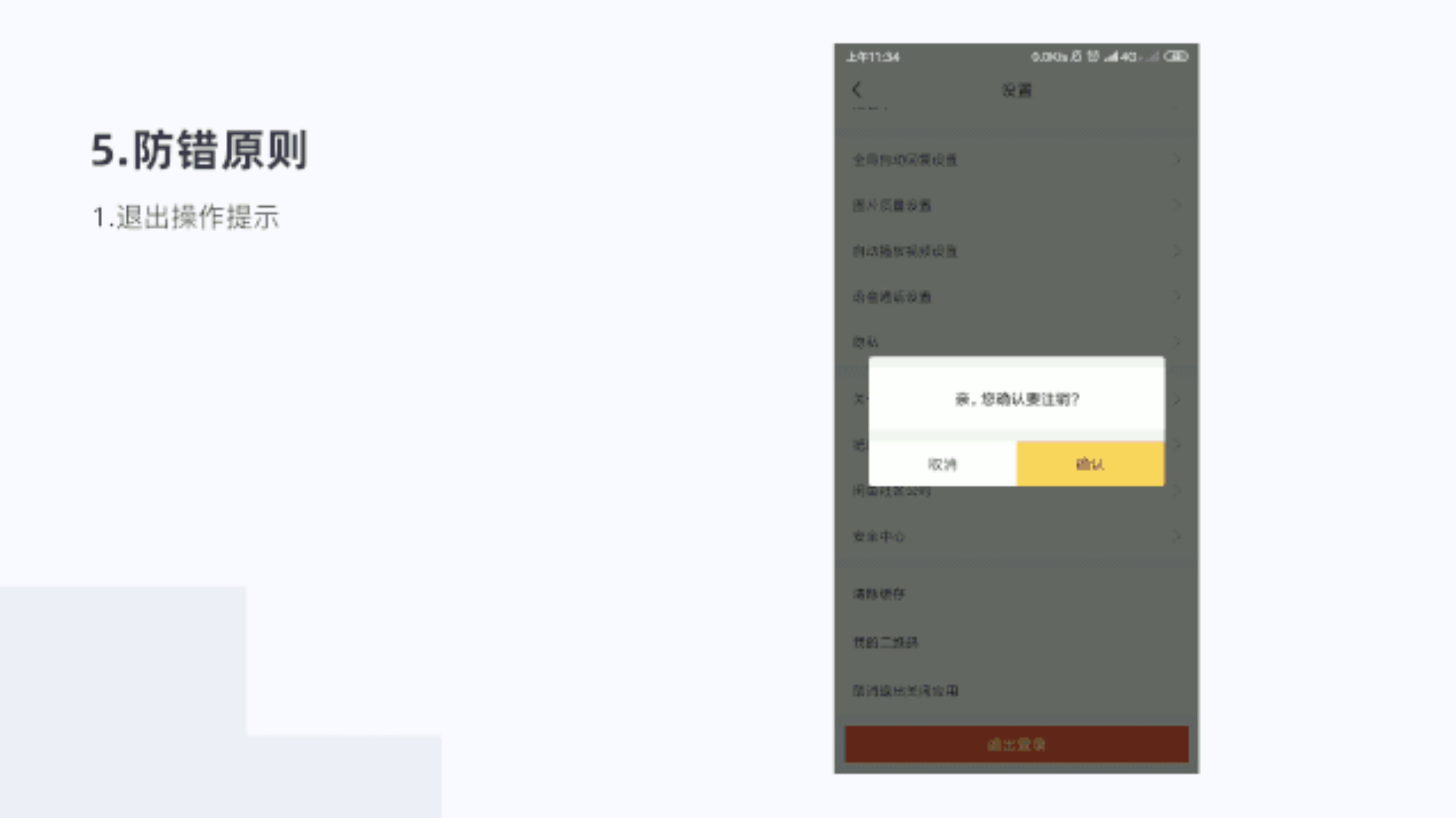 在退出登錄提示是否要注銷登錄,把確認層級加大,放在右邊,清晰提示用戶,防止用戶出錯