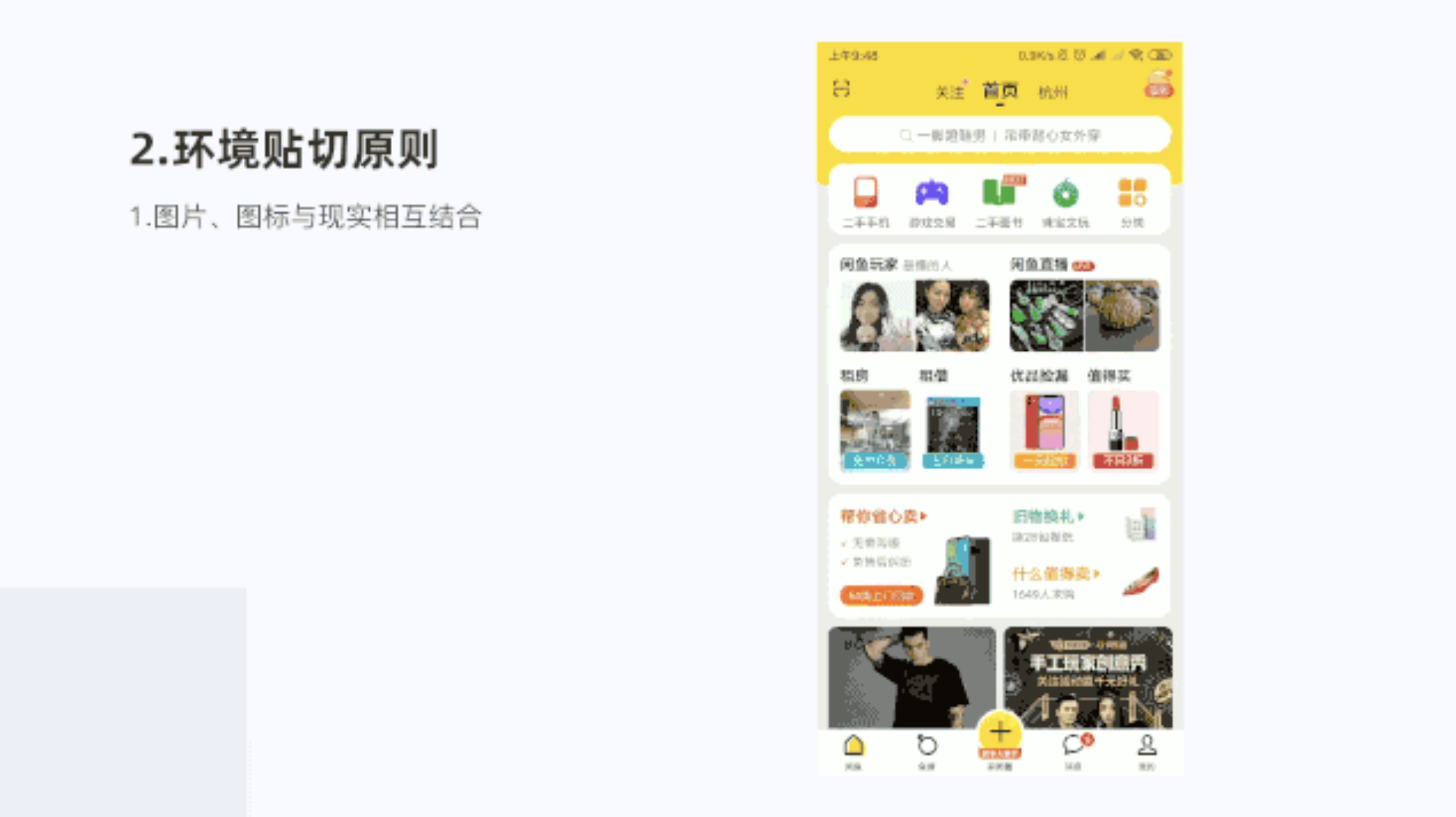 在閑魚首頁功能頁面,二手手機圖標采用現實生活手機作為造型,游戲交易采用游戲手柄作為造型,二手圖書采用圖書翻頁形式作為造型,珠寶文玩采用珠寶玉器作為造型,符合用戶在現實生活中熟悉的東西,滿足認知,有良好體驗。