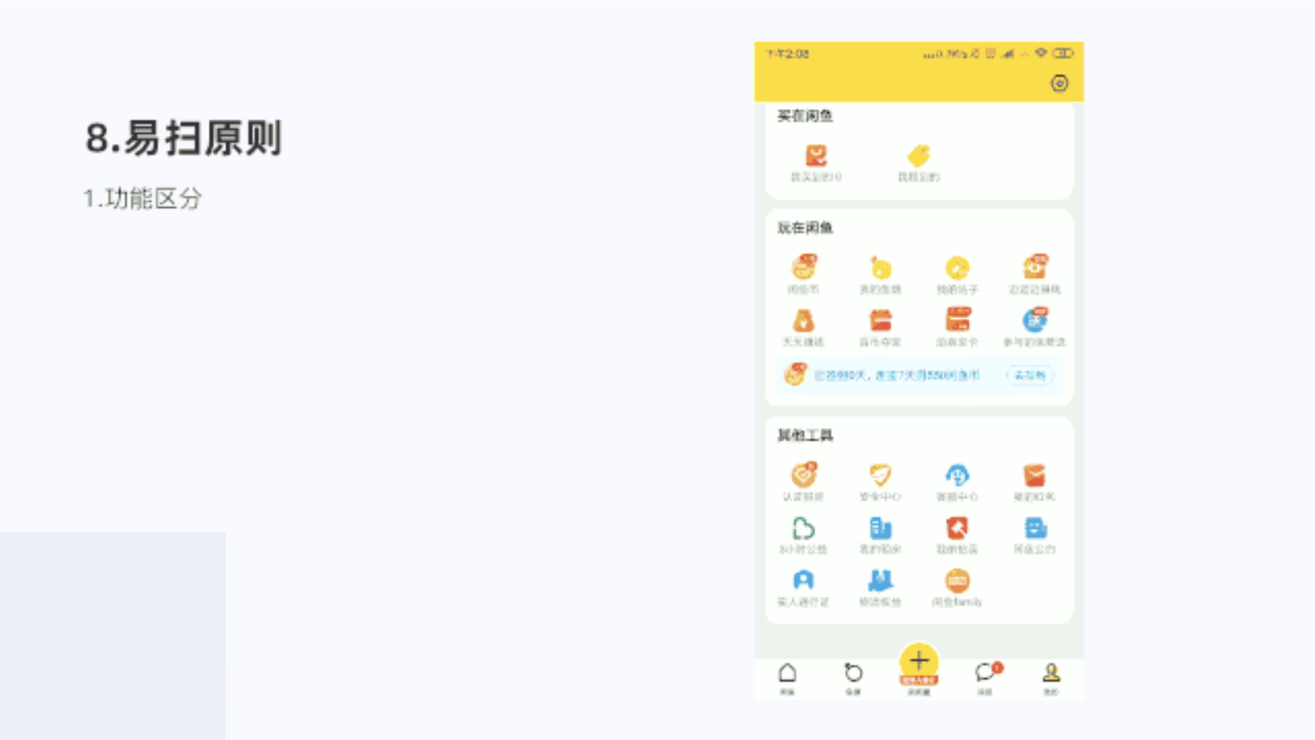 閑魚首頁分為4大部分,功能區域、活動區域、閑置區域、分類區域,每個區域相互親密,形成一個整體,通過間距分割,滿足用戶的易讀性,降低學習記憶負擔。