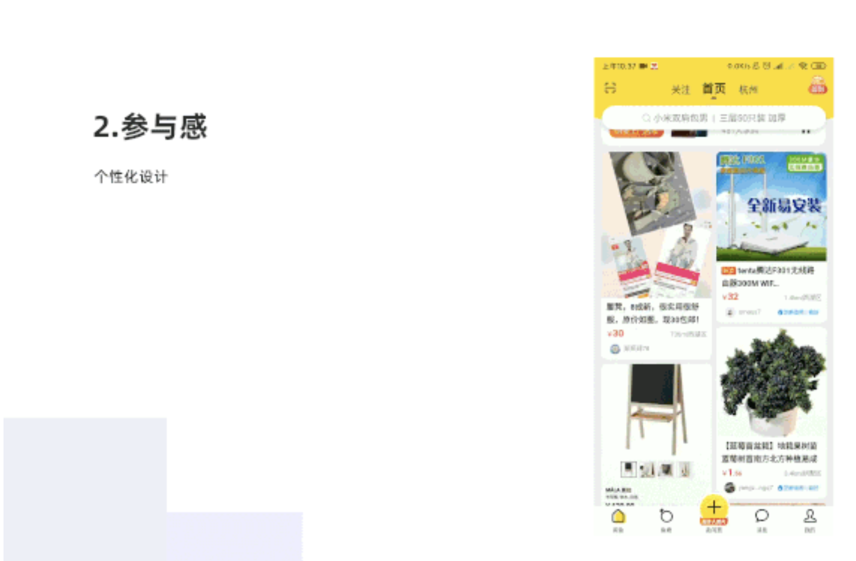 個性化設計,為用戶提供獨一無二的個性化設計,帶來個性化服務,滿足用戶對閑置產品的需求,也同時滿足用戶發布閑置同類商品可參考的需求。當用戶想購買閑置植物盆栽比較多時,首頁就會出現推薦的盆栽商品。