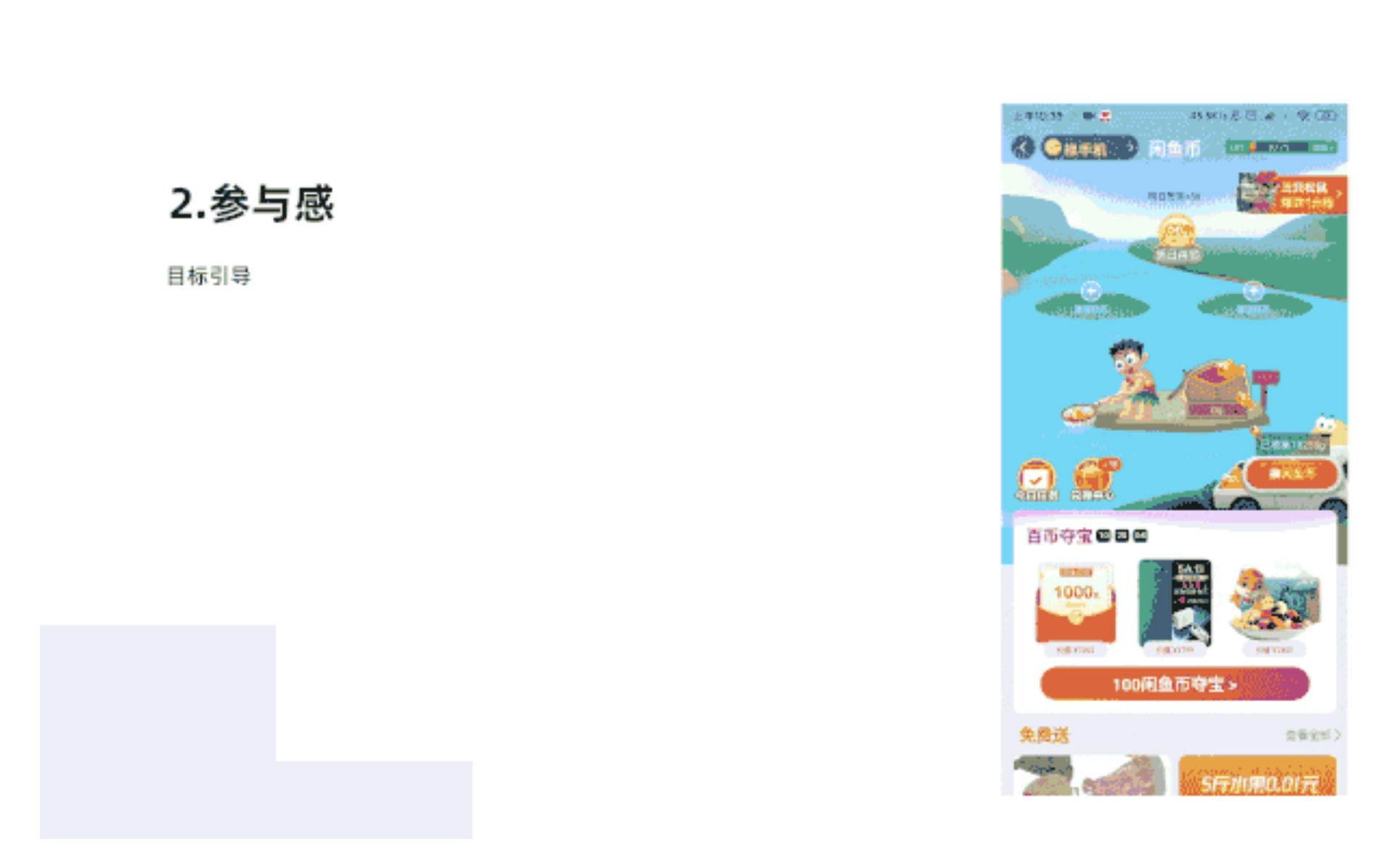 目標引導設計,劃定規則和目標路徑,引導用戶參與其中,在簽到活動頁面一個小路徑,用戶點擊撈魚,撈上來之后,就可以兌換閑魚幣了,讓用戶趣味游戲同時獲得閑魚幣,提升參與感,增強了用戶體驗。