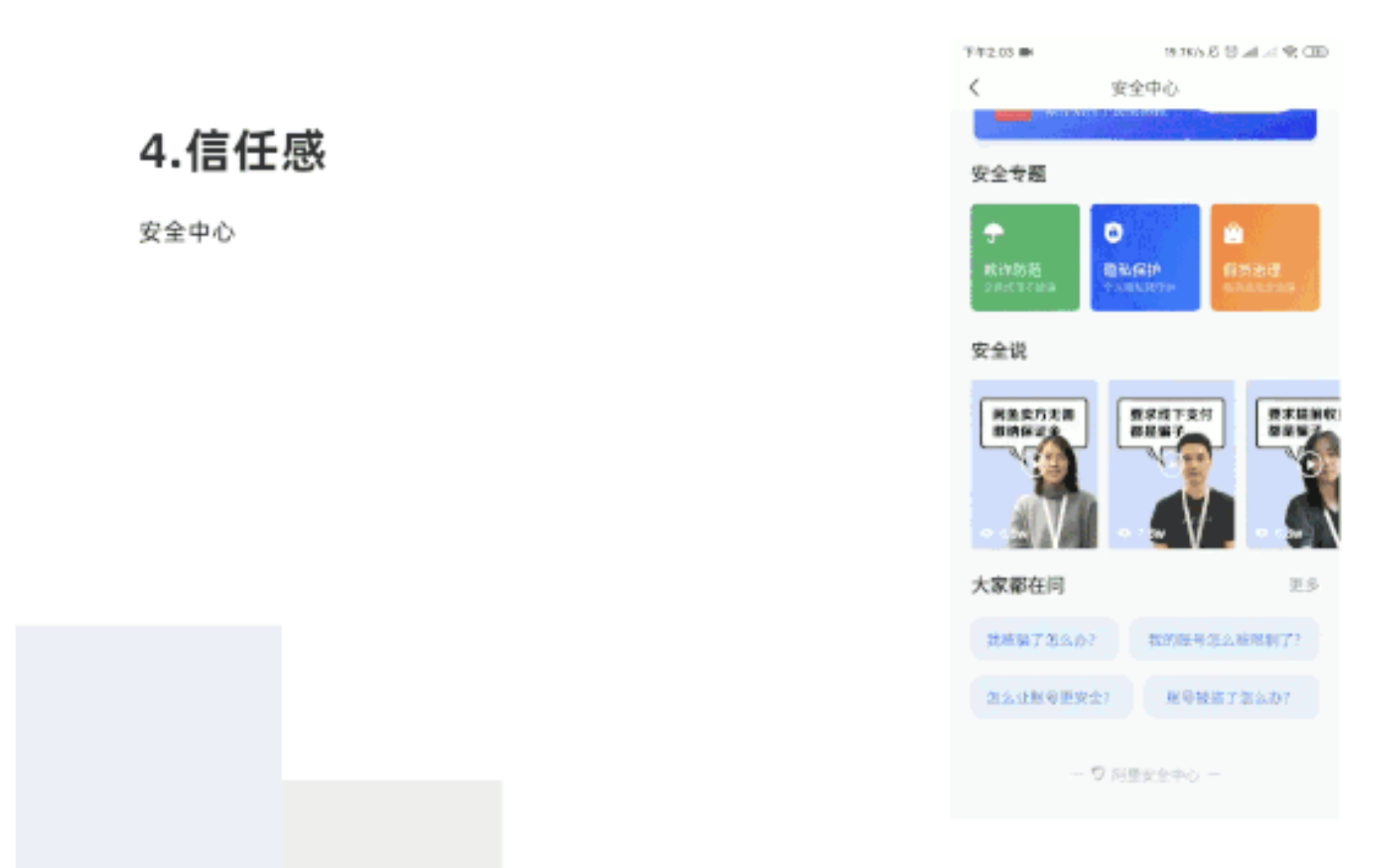 我的頁面有安全中心,可以購買欺詐保障,了解安全知識和安全操作,減輕用戶交流,提升信任感。