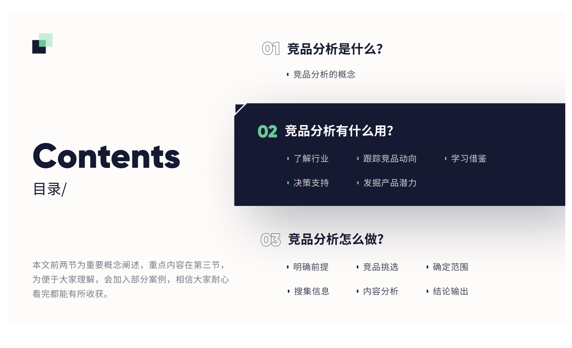 - 決策支持:判斷是否進入新市場、是否做新產(chǎn)品,若確定,幫助新產(chǎn)品定位,找到細分市場和人群,制定競爭策略,避免與行業(yè)巨頭正面硬杠。