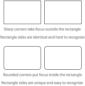 尖角指向外側(cè),會降低矩形內(nèi)部內(nèi)容的視覺焦點。當(dāng)兩個矩形相鄰時,尖角也使得難以區(qū)分矩形的兩邊。這是因為矩形的每條邊都是直線。圓角矩形的邊是獨一無二的,因為這些線條會向其所屬的矩形彎曲。