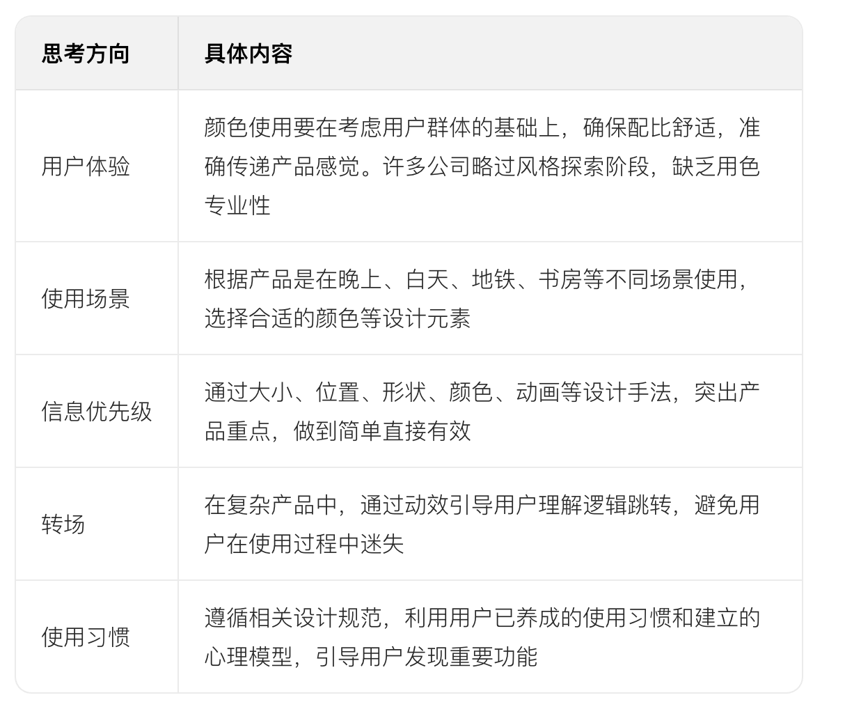 UI 設計需從產品經理、交互設計師、用戶和自我這 4 個角度思考:像產品經理一樣關注用戶群體、相關競品、主要商業模式;像交互設計師一樣考慮用戶體驗、使用場景、信息優先級、轉場、使用習慣;像用戶一樣思考產品能否解決問題、設計是否美觀、使用是否順暢;像自己一樣保持設計觀,不盲目接受錯誤設計。如此才能做出符合用戶需求且有自己韻味的設計。