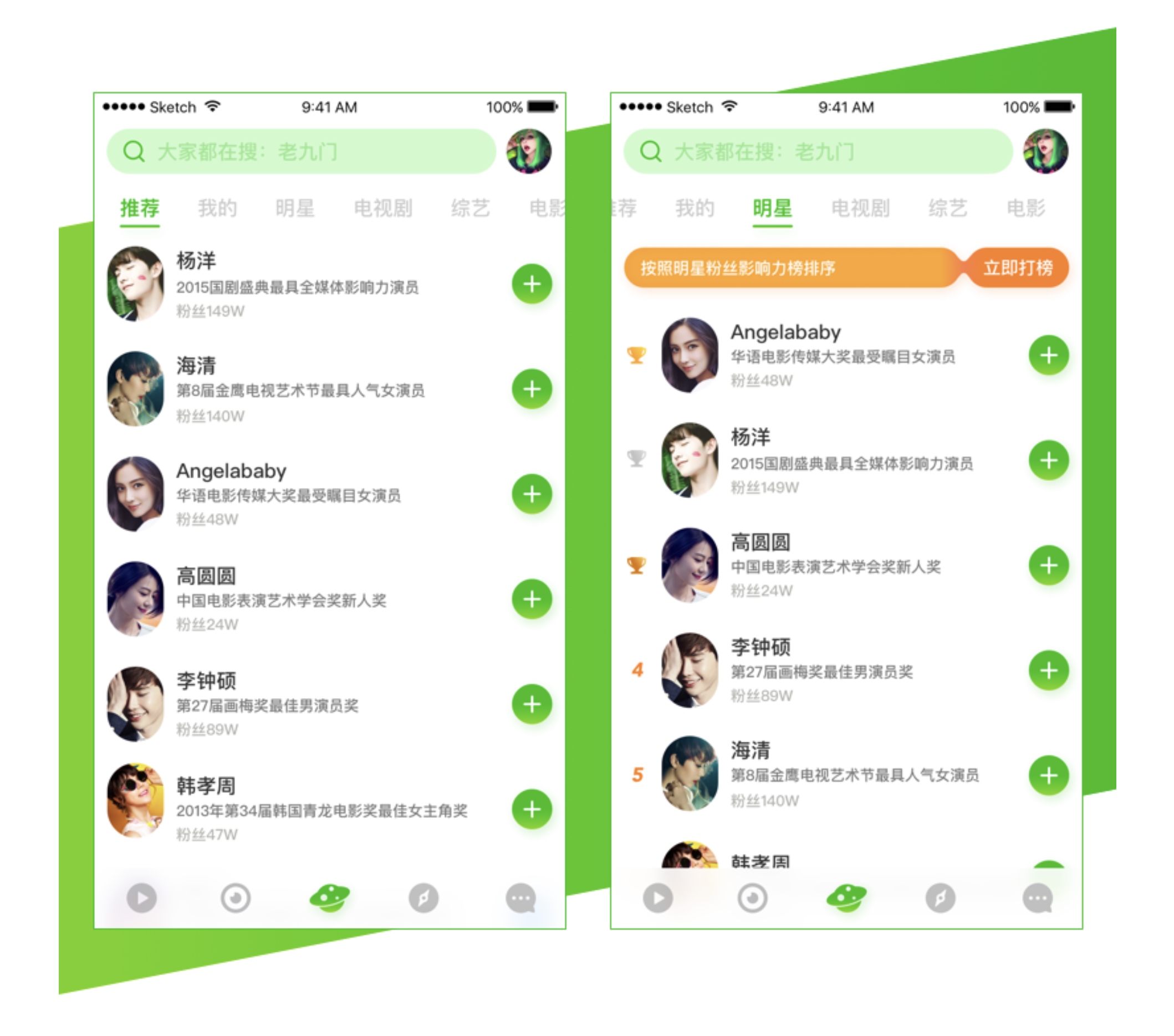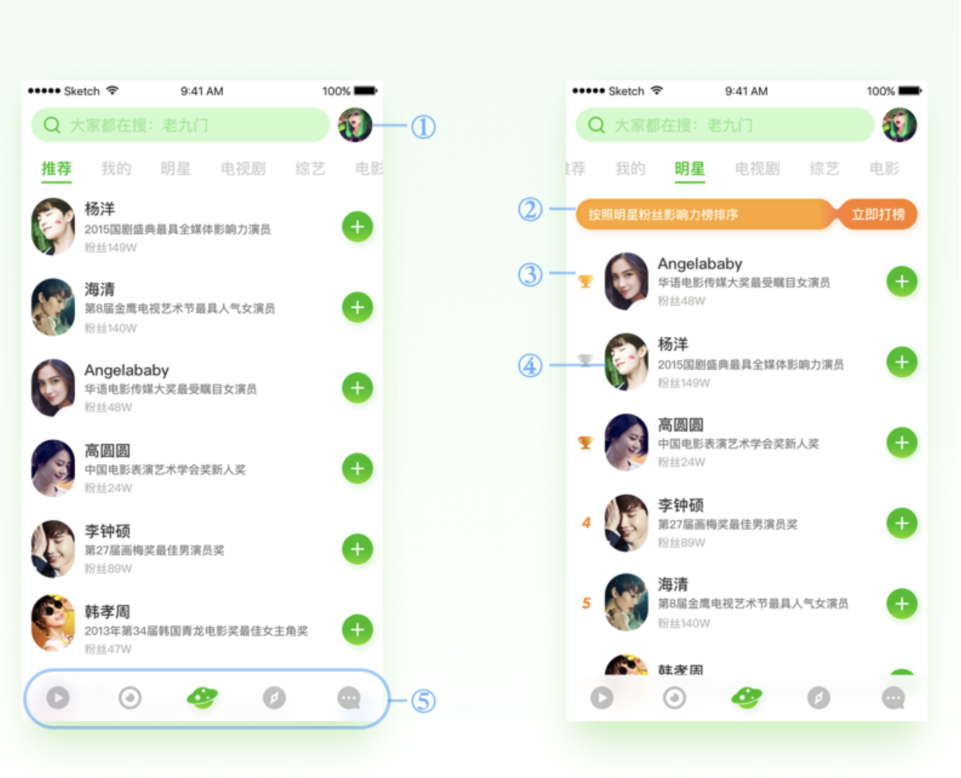 - 信息展示:明星圈簡介字段保留,布局與推薦頁一致;明星標(biāo)簽頁將排序信息放列表左側(cè),不外露影響力分值等與排名相關(guān)信息,營造榜單氛圍。