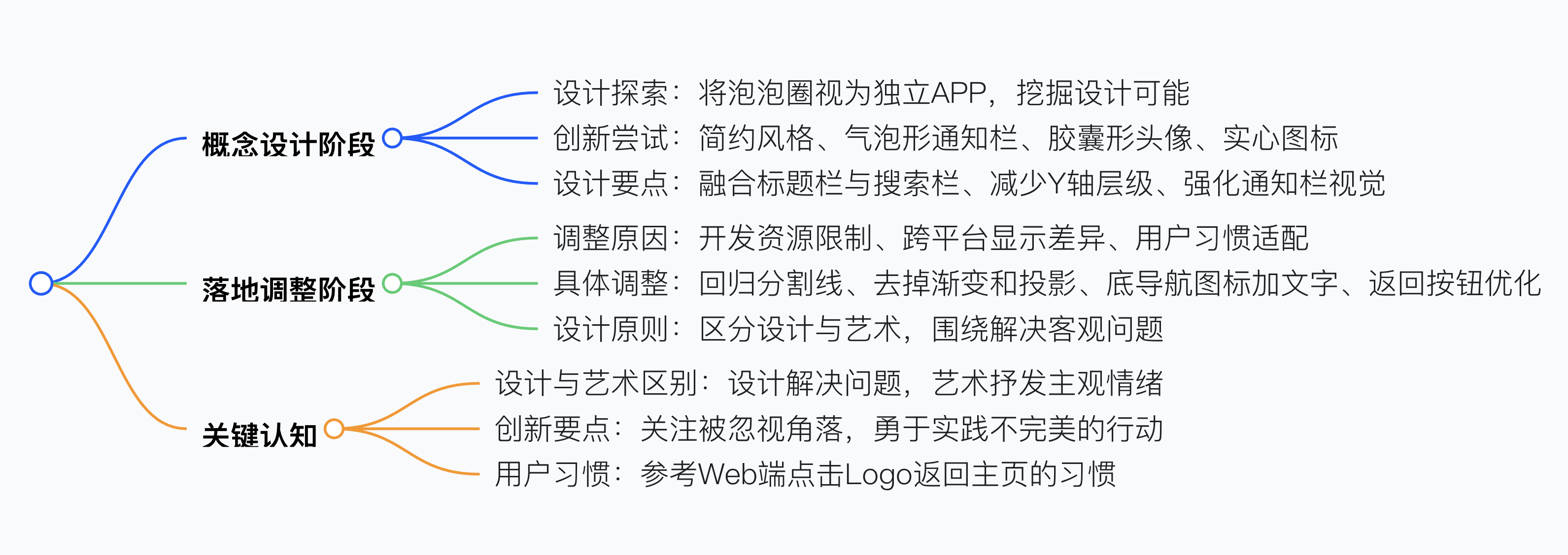 UI 設(shè)計思路應(yīng)先放飛概念探索多種可能,如將泡泡圈視為獨(dú)立 APP 進(jìn)行設(shè)計,嘗試簡約風(fēng)格、氣泡形通知欄、膠囊形頭像、實心圖標(biāo)等創(chuàng)新設(shè)計,再結(jié)合實際落實到產(chǎn)品,比如因開發(fā)資源和屏幕顯示限制去掉漸變和彌散投影、回歸分割線和返回按鈕,同時要明確設(shè)計與藝術(shù)的區(qū)別,設(shè)計需圍繞客觀問題解決,概念稿后要提取可用點推動落地,注重用戶習(xí)慣和跨平臺適配,像用愛奇藝 Logo 代替文字返回按鈕。