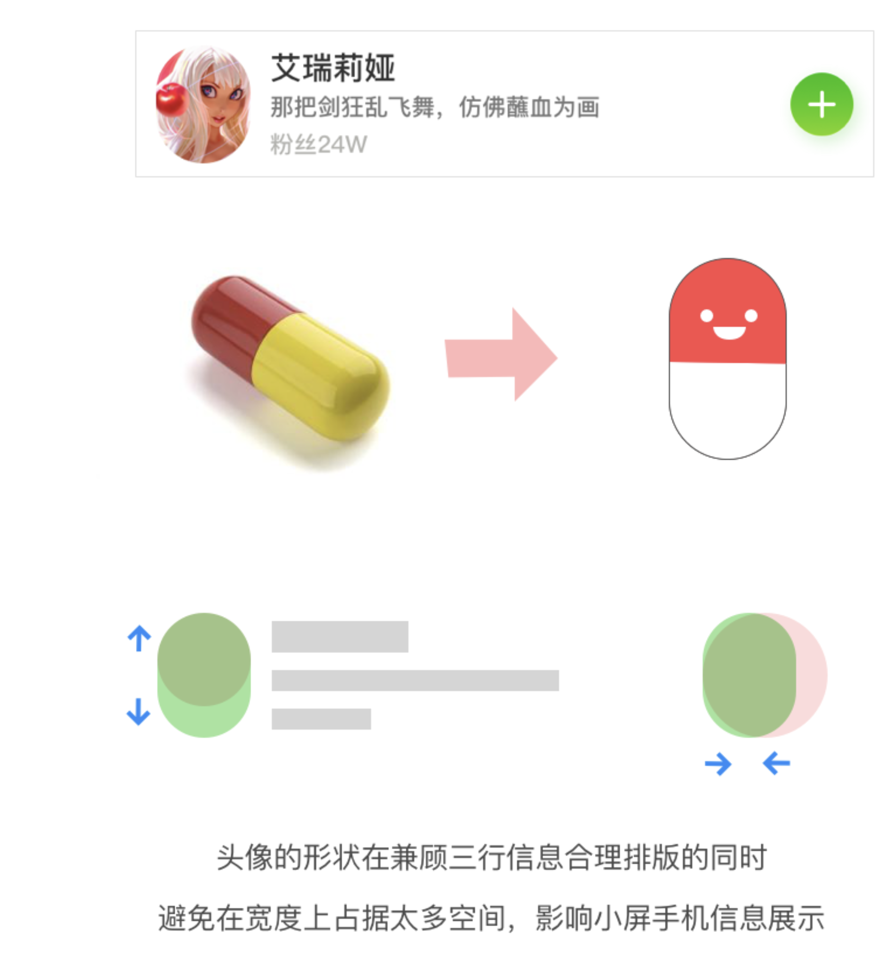 - 頭像形狀:首創(chuàng)膠囊形頭像,兼顧三行信息排版,避免小屏手機(jī)寬度占用過多空間。