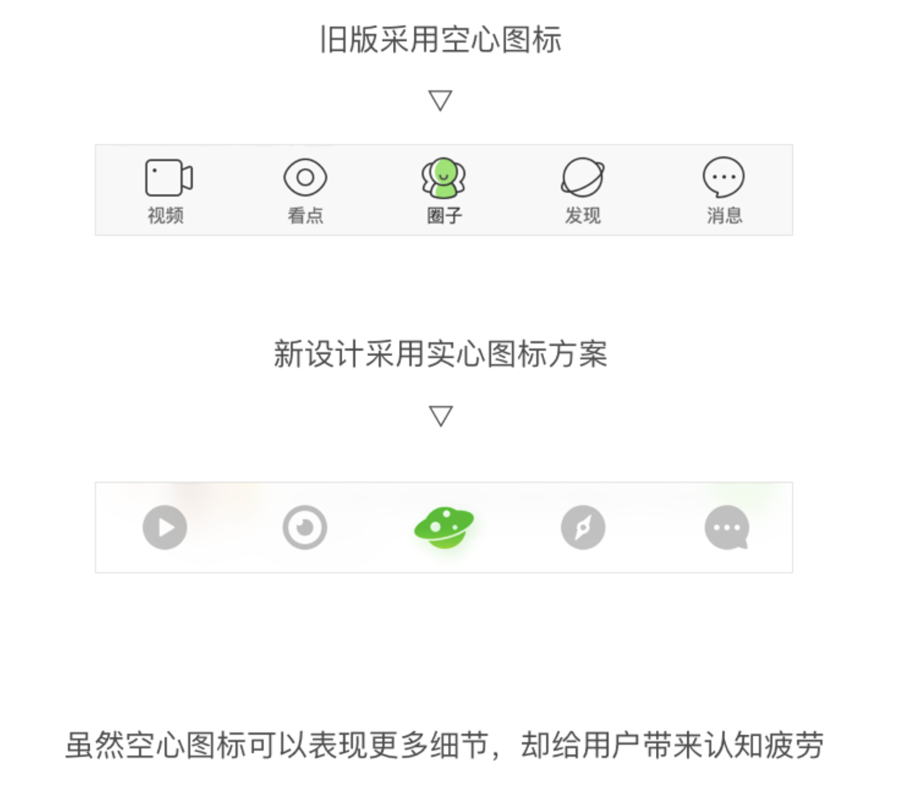 - 圖標(biāo)選擇:采用實心圖標(biāo),依據(jù)國外設(shè)計師 Aubrey Johnson 的 25000 個圖標(biāo)識別實驗,實心圖標(biāo)更符合大眾審美且識別速度更快,如手機(jī) QQ 和 Apple Music 也改用實心圖標(biāo)。
