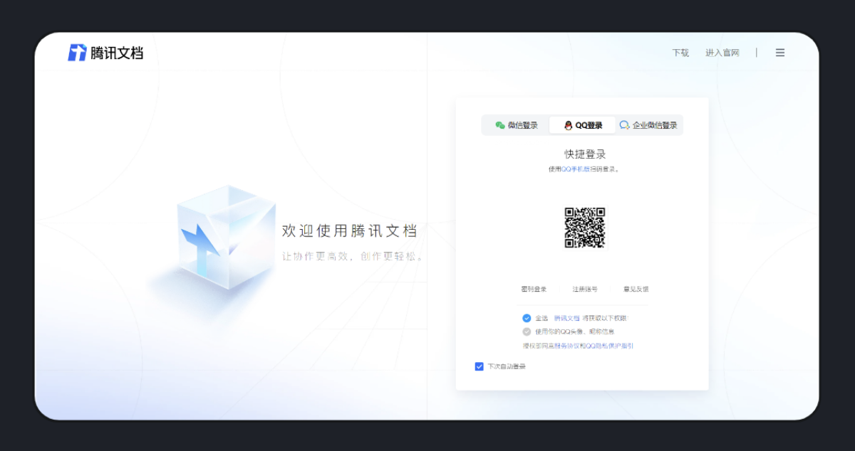 在符合業(yè)務邏輯的基礎上,體驗設計能優(yōu)化 B 端產(chǎn)品復雜的流程,將復雜的迷宮簡化成一條直線,讓用戶操作界面時感到暢通舒適。騰訊文檔的登錄頁沒有讓用戶輸入一連串的賬號和密碼,而是采用二維碼方式,用戶掃碼即可登錄,快捷又方便,大大簡化了登錄流程。