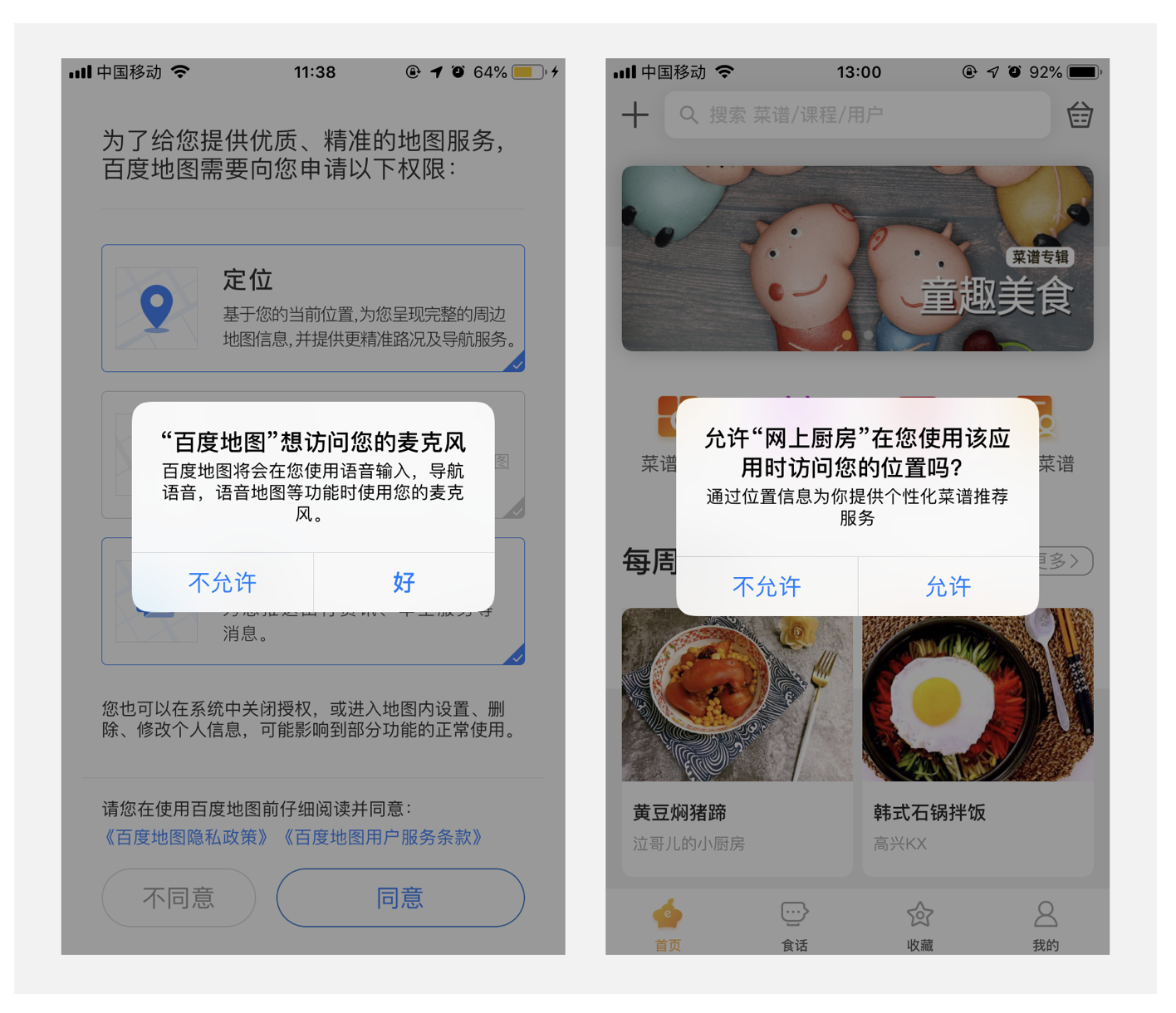 - 系統(tǒng)功能的授權(quán):如 “百度地圖” 申請(qǐng)?jiān)L問麥克風(fēng)、“網(wǎng)上廚房” 申請(qǐng)?jiān)L問位置的彈窗,這類屬于系統(tǒng)自帶的授權(quán)彈窗,在許多 APP 中都較為常見。