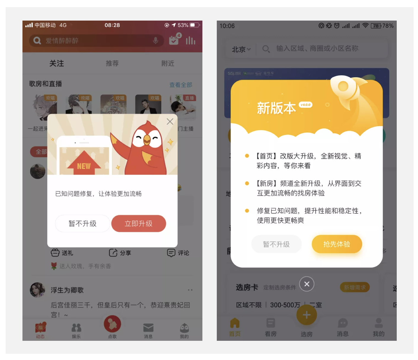 - 版本更新:版本升級(jí)彈窗通常會(huì)弱化 “暫不升級(jí)” 按鈕,突出 “升級(jí)” 主按鈕,告知用戶新版本的變化和優(yōu)勢(shì)。