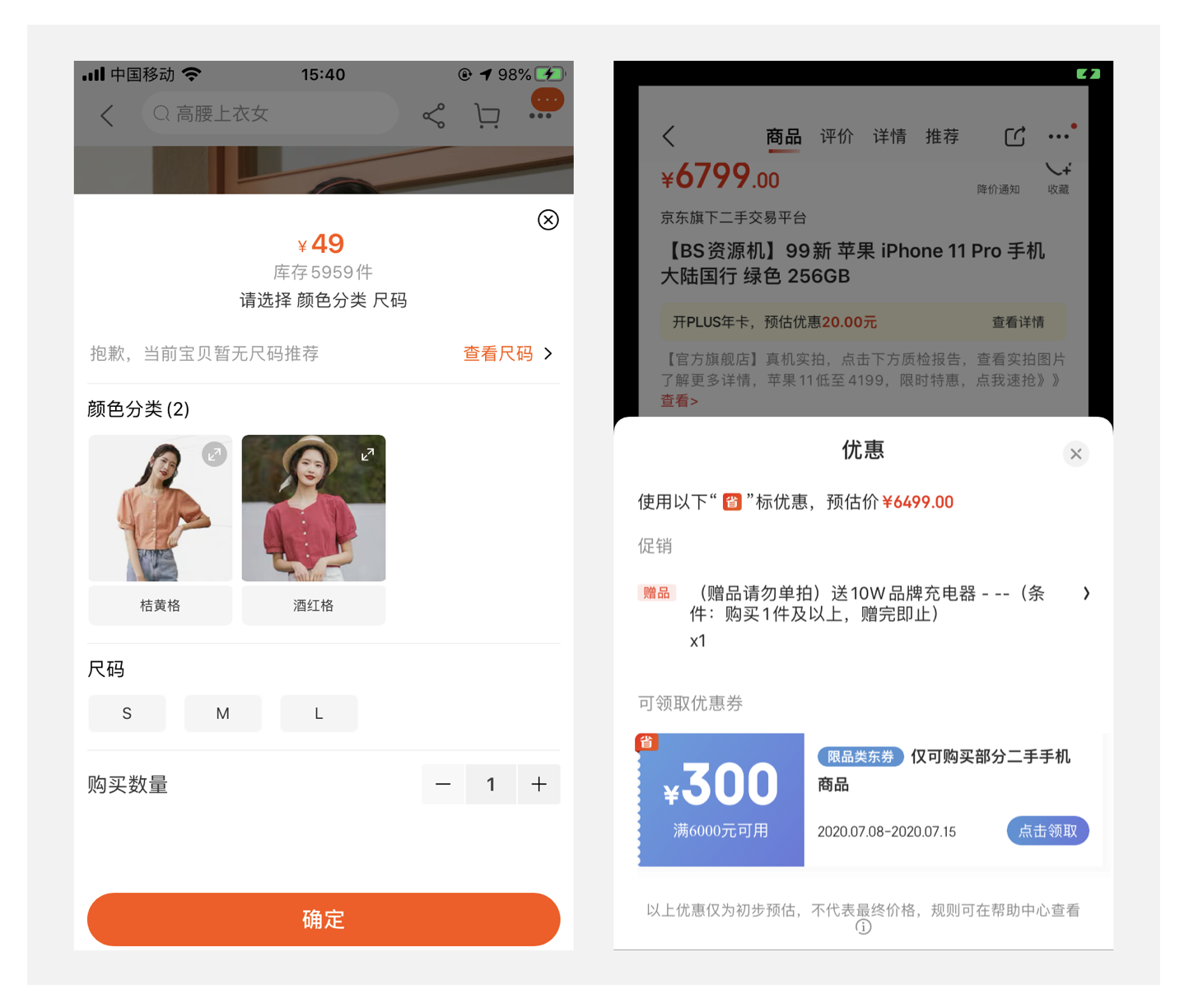- 半屏彈窗:淘寶和京東的購買頁面彈窗是比較典型的例子,在各種電商產(chǎn)品中應(yīng)用廣泛,方便用戶選擇商品規(guī)格、數(shù)量等。