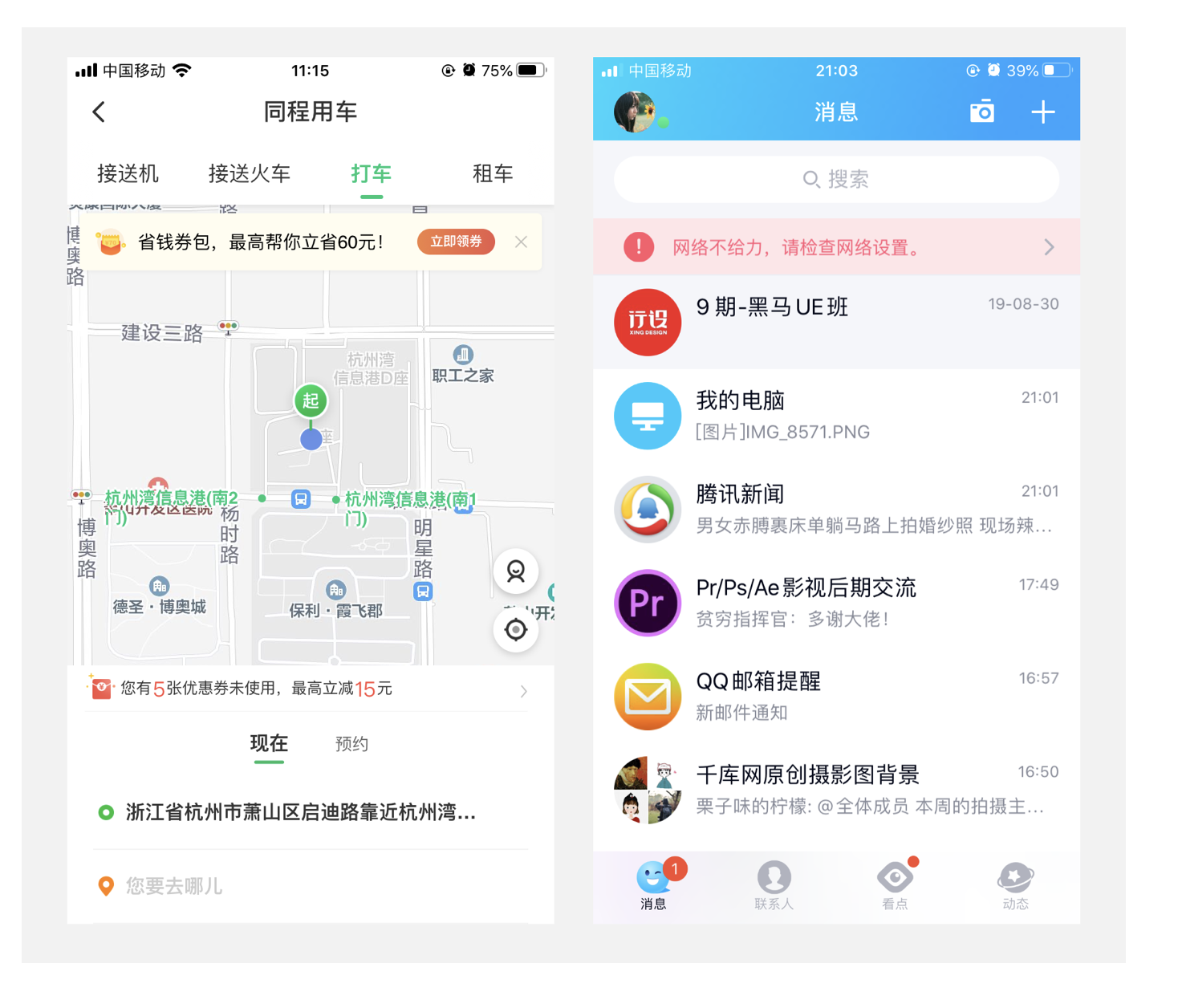 這是 Android 中的一個(gè)控件,會(huì)超時(shí)自動(dòng)關(guān)閉或者在屏幕上滑動(dòng)關(guān)閉,出現(xiàn)時(shí)間比 Toast 長,且可以點(diǎn)擊按鈕進(jìn)行交互。如京東的 Snackbar 提示用戶點(diǎn)擊箭頭查看喜歡的商品,為用戶推薦商品,并有關(guān)閉按鈕;酷狗音樂的 Snackbar 給用戶提供開通會(huì)員的快捷入口,一直浮于頁面底部,沒有關(guān)閉按鈕;同程用車的領(lǐng)券活動(dòng)彈窗也屬于此類,是常用的營銷手段;QQ 的斷網(wǎng)提示類似通知條樣式,會(huì)浮于頁面上方直到網(wǎng)絡(luò)恢復(fù)。