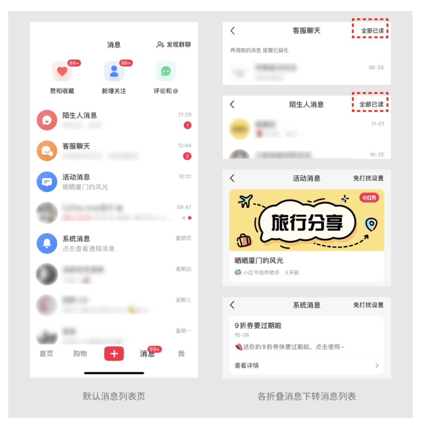 但到了 “客服聊天” 和 “陌生人消息” 里,“全部已讀” 就出現了。客服消息大多是 “訂單咨詢”“售后反饋”,事情解決后就成了沒用的歷史記錄;陌生人消息里可能有營銷騷擾,默認折疊還能避免打擾。我上次在小紅書買衣服,和客服聊完尺碼后,點 “全部已讀” 把對話清掉,消息頁瞬間清爽,也不會誤刪重要的社交消息。