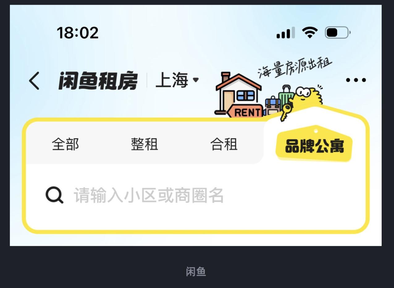 傳統(tǒng)租房板塊多以 “文字 + 普通卡片” 呈現(xiàn),用戶需先讀文字才能識別功能;閑魚則直接將 “房屋結(jié)構(gòu)” 轉(zhuǎn)化為視覺符號 —— 卡片上用簡化的房屋輪廓圖標替代傳統(tǒng)標簽,配合 “RENT” 英文標識,讓用戶一眼就能關(guān)聯(lián) “租房” 業(yè)務(wù)。這種設(shè)計不僅強化了業(yè)務(wù)屬性,還通過圖形化降低了信息識別成本,同時獨特的視覺符號也加深了用戶對產(chǎn)品的記憶度。