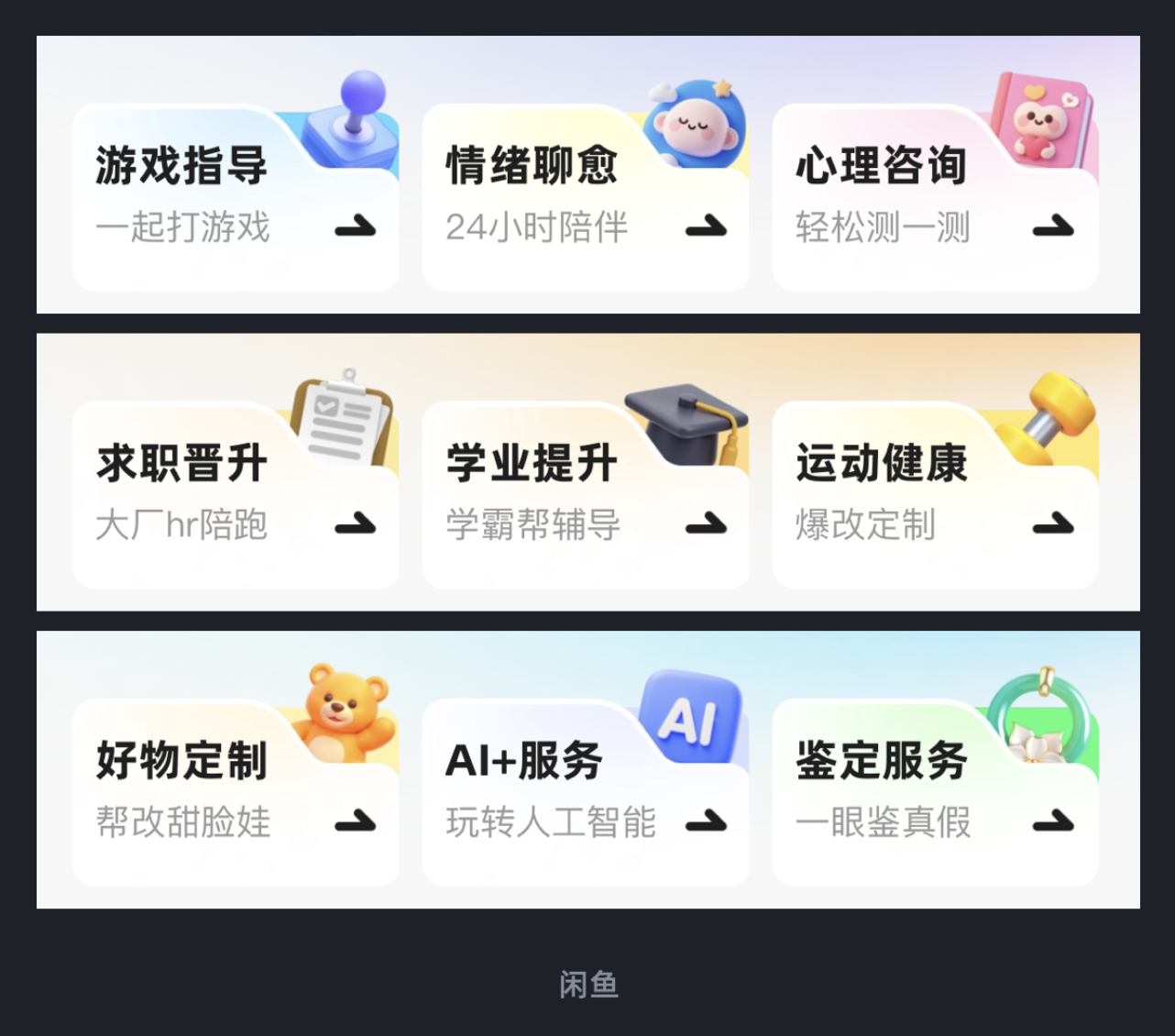 閑魚的副業(yè)模塊(如游戲指導(dǎo)、情緒聊愈、心理咨詢)采用 “異形卡片” 設(shè)計:每張卡片的右上角都做了凹陷處理,將功能圖標嵌入凹陷處,形成 “卡片 - 圖標” 的第一層關(guān)聯(lián);同時,每張異形卡片下方又疊加了一層淺色調(diào)的背景卡片,通過色彩深淺和輪廓差異,形成 “背景卡片 - 異形卡片 - 圖標” 的三層結(jié)構(gòu)。這種設(shè)計不僅讓每個副業(yè)模塊的邊界更清晰,還通過 Z 軸層級的差異,避免了多模塊排列的呆板感,用戶能快速識別不同功能。