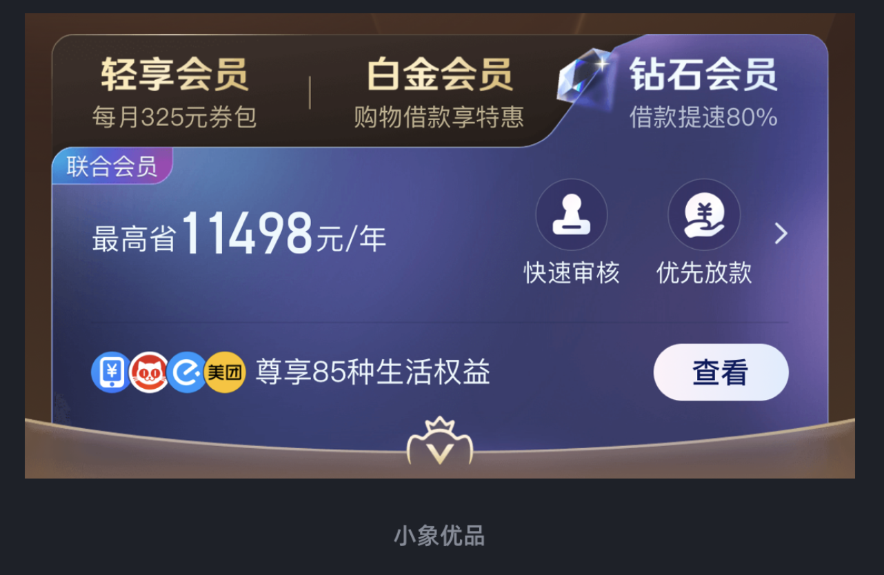 會員卡片的核心需求是 “區(qū)分等級”,但傳統(tǒng)設(shè)計多依賴 “顏色差異”(如青銅、白銀、黃金色),缺乏質(zhì)感層次,難以體現(xiàn)會員的 “尊貴感”。小象優(yōu)品的 PLUS 會員卡片設(shè)計,卻用 “光影細節(jié)” 和 “異形結(jié)構(gòu)”,讓等級區(qū)分更高級。